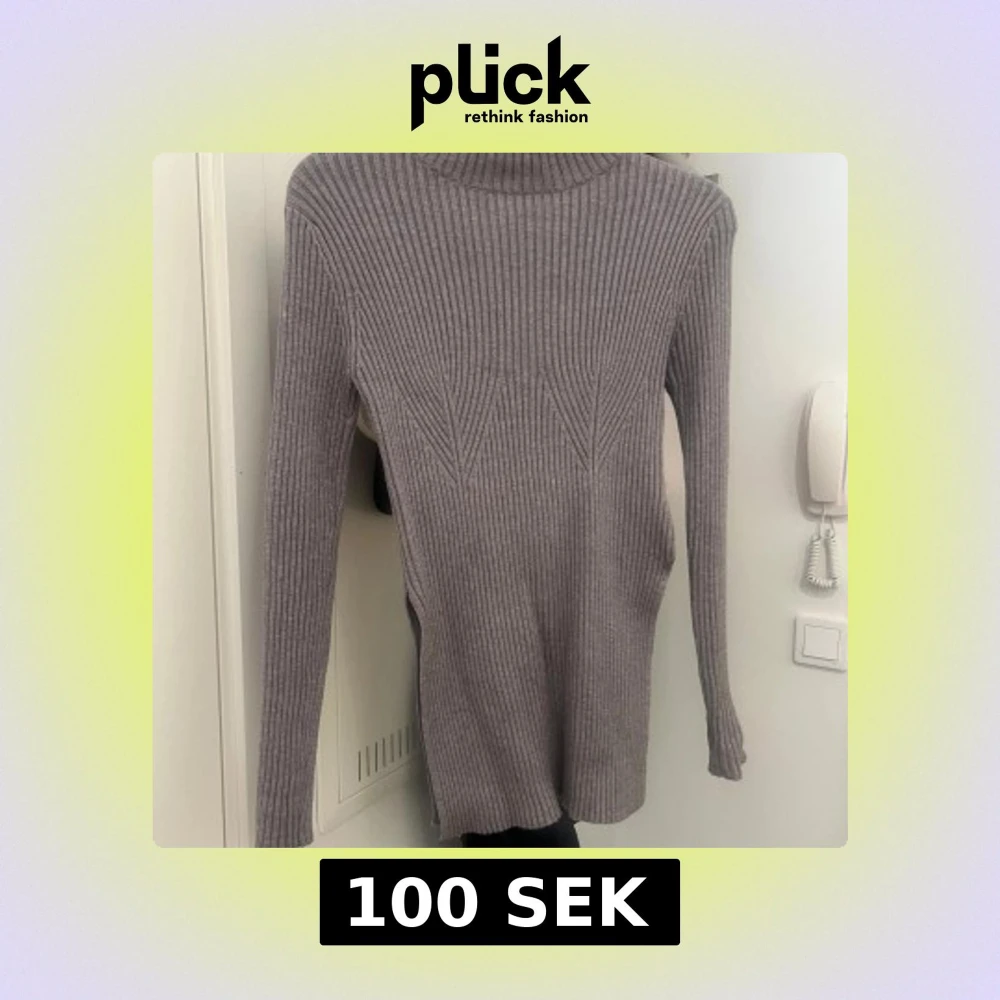 Säljer en ljusgrå ribbstickad polotröja med lång ärm och hög krage. Tröjan har snygga slitsar i sidorna och en figurnära passform. Perfekt till lager-på-lager och enkel att styla med jeans eller kjol. Den är lite söndrig på ena sidan vilket funkar om man bara syr igen den.