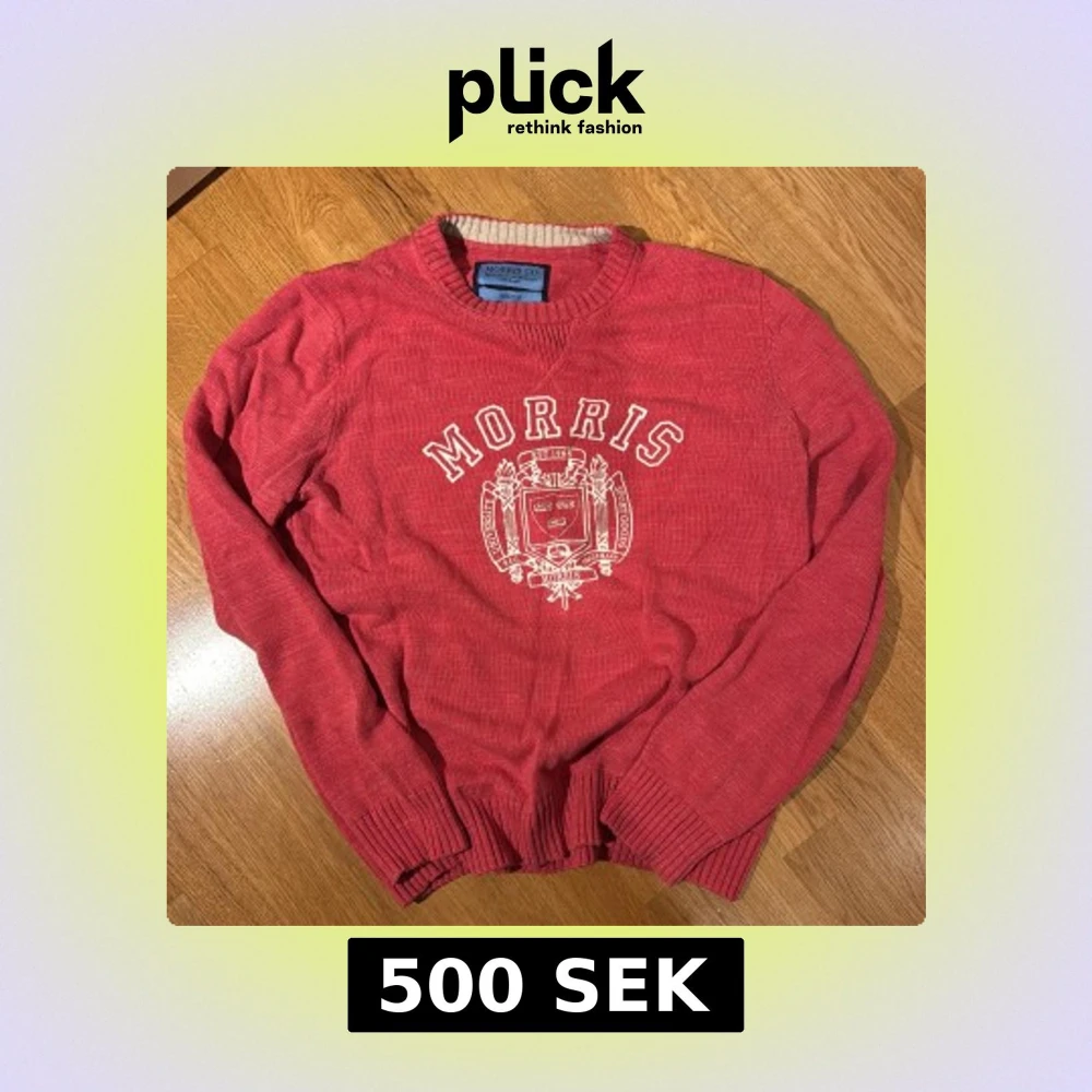 Säljer en röd stickad tröja från Morris Co med vit broderad logga och emblem på bröstet. Tröjan har rund halsringning, ribbade muddar och lång ärm. Perfekt för dig som gillar klassisk college-stil.