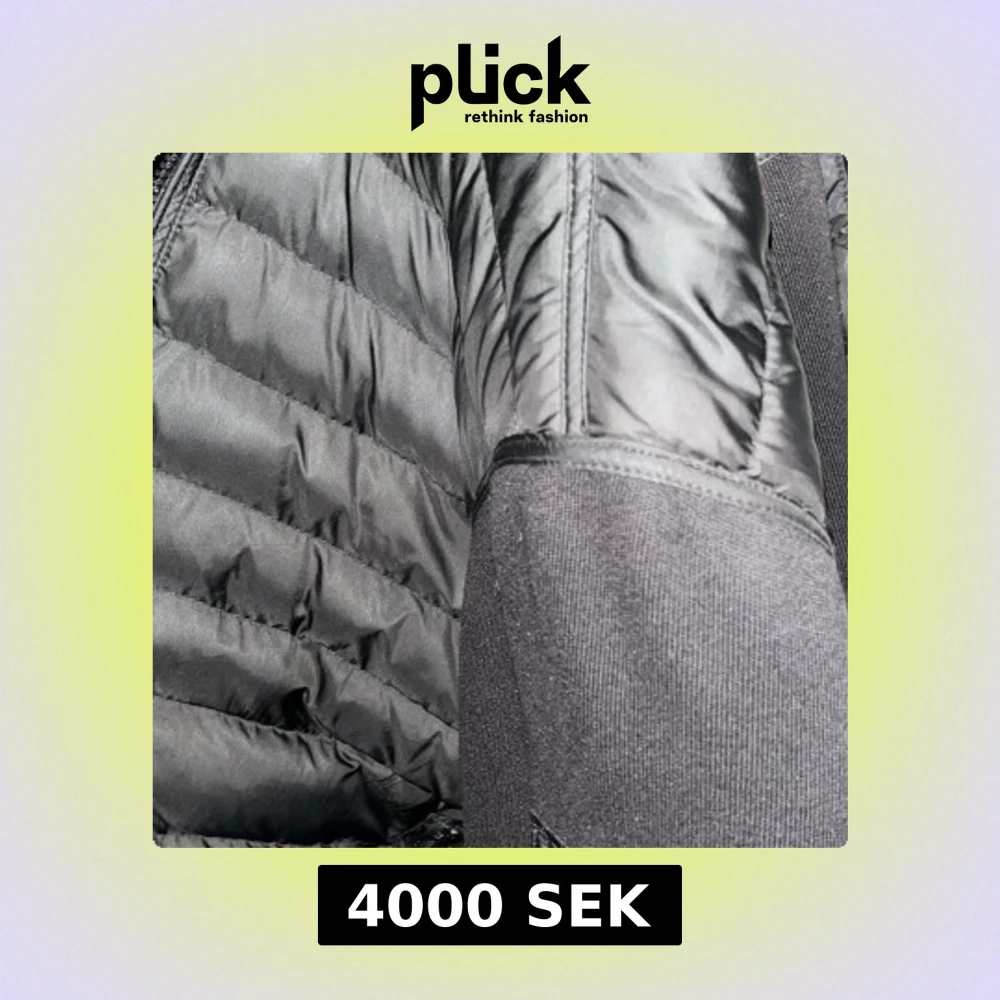 Säljer en svart pufferjacka med snygga stickade partier på sidorna och ärmarna. Jackan har quiltade paneler och en modern look som passar perfekt till kalla dagar. Dragkedja framtill och stilren design.