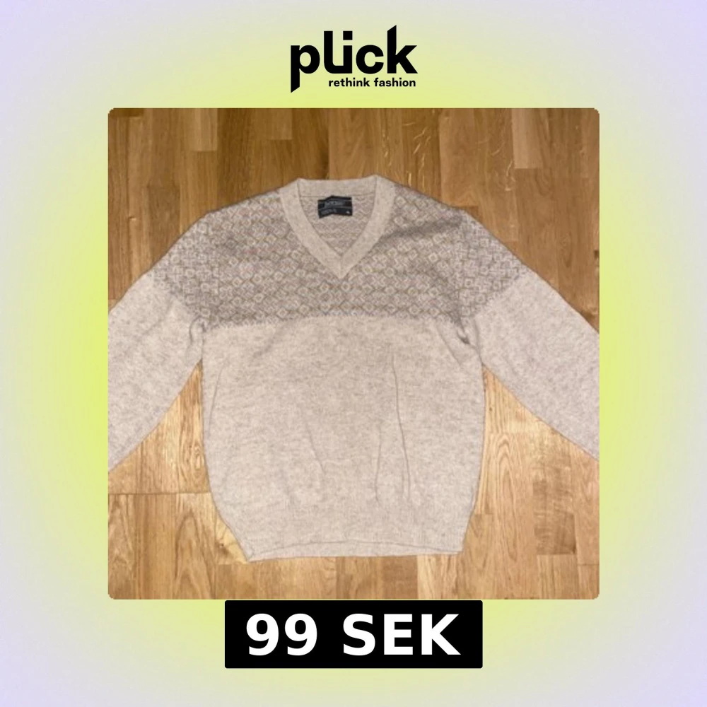 Säljer en beige stickad tröja från Glenmore med ett diskret mönster i grått och vitt över bröstet. Tröjan har en v-ringad hals och långa ärmar, perfekt för kyligare dagar. Den är både stilren och bekväm.