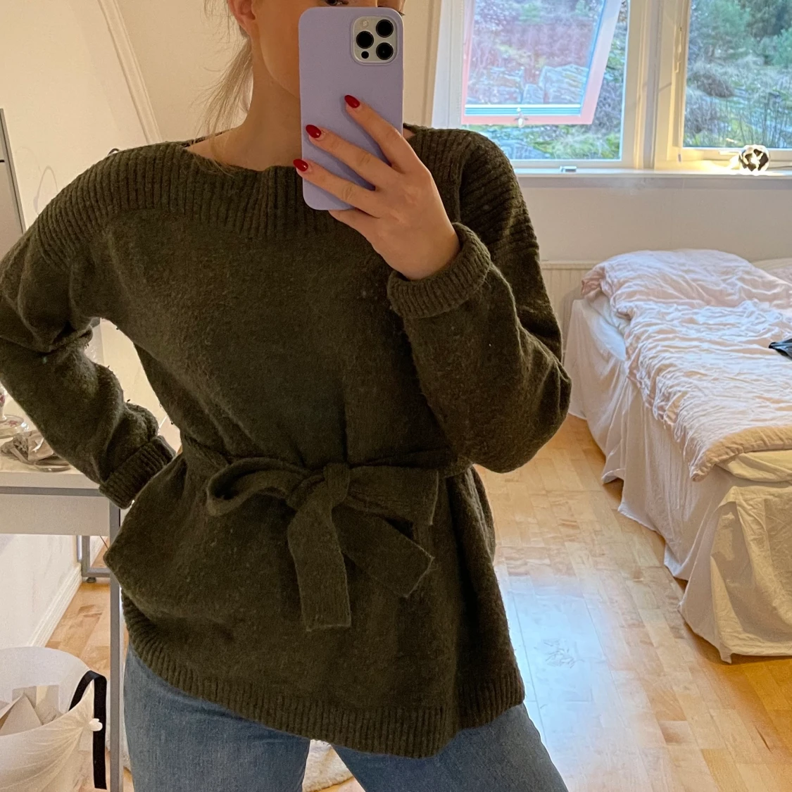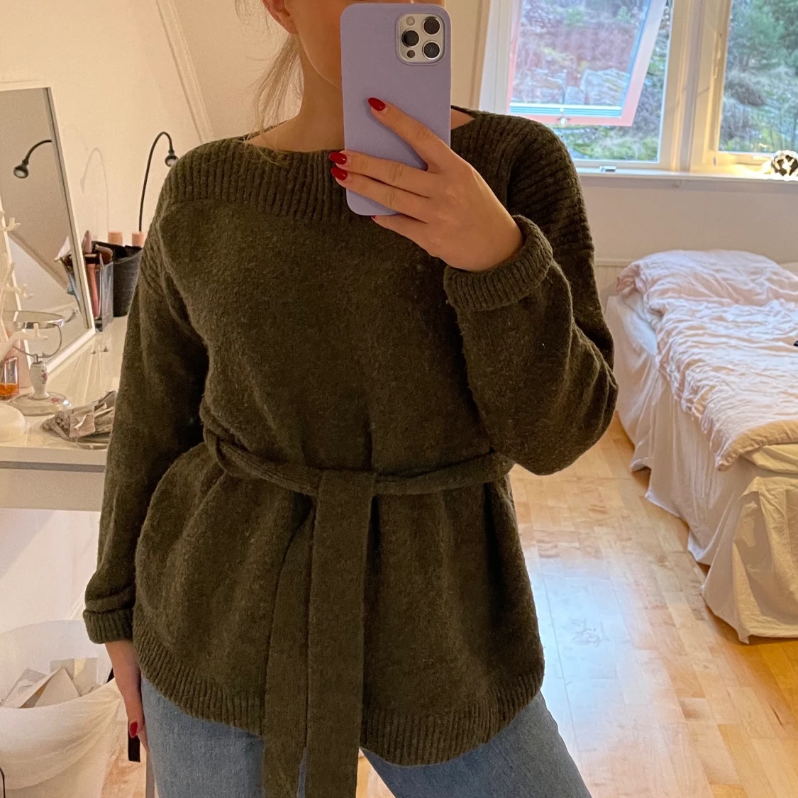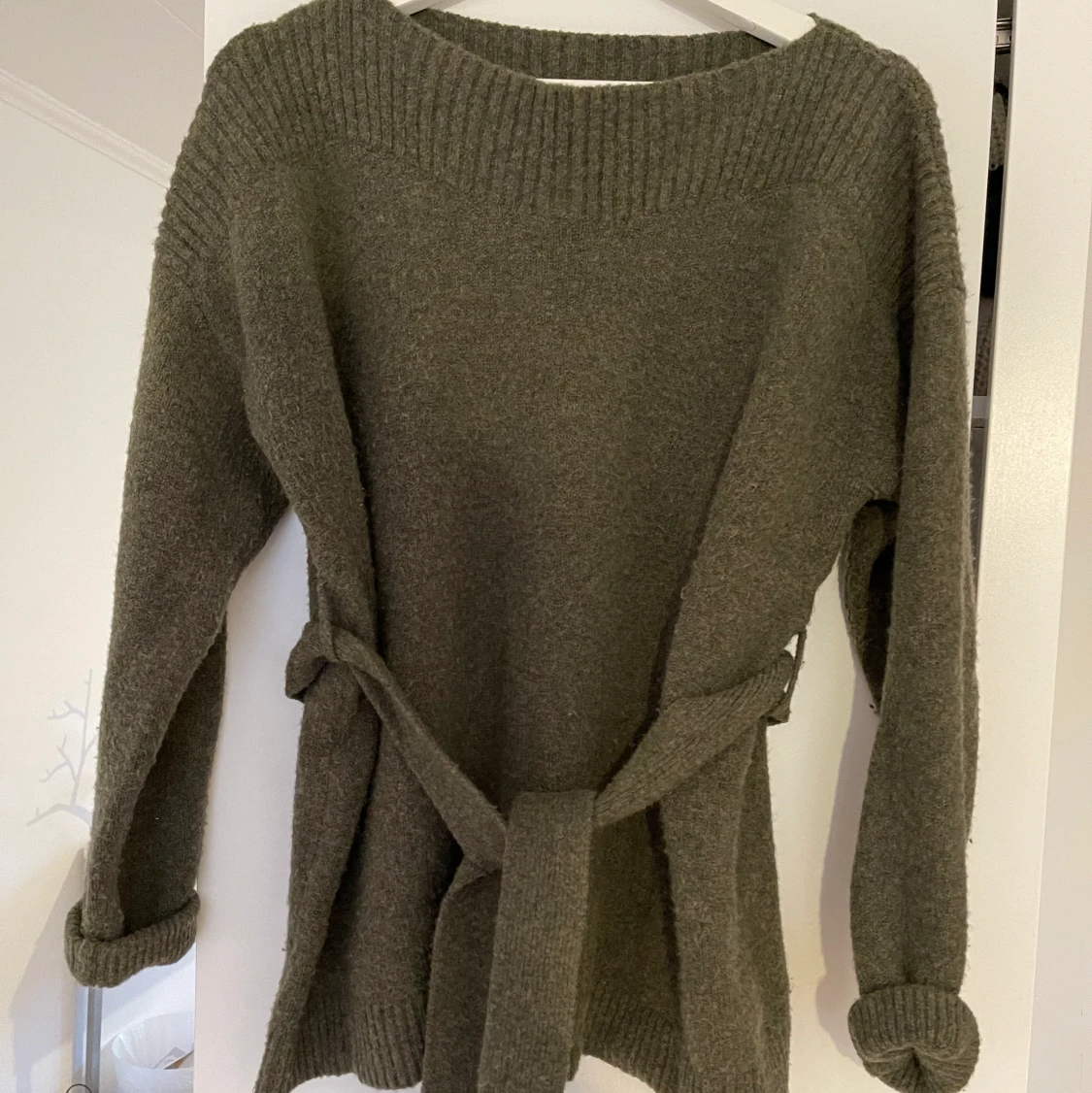 En fin stickad tröja med knyt i midjan, i väldigt mjukt material. Knappt använd. Säljer för 250 kr eller högstbjudande. Köparen står för frakten.