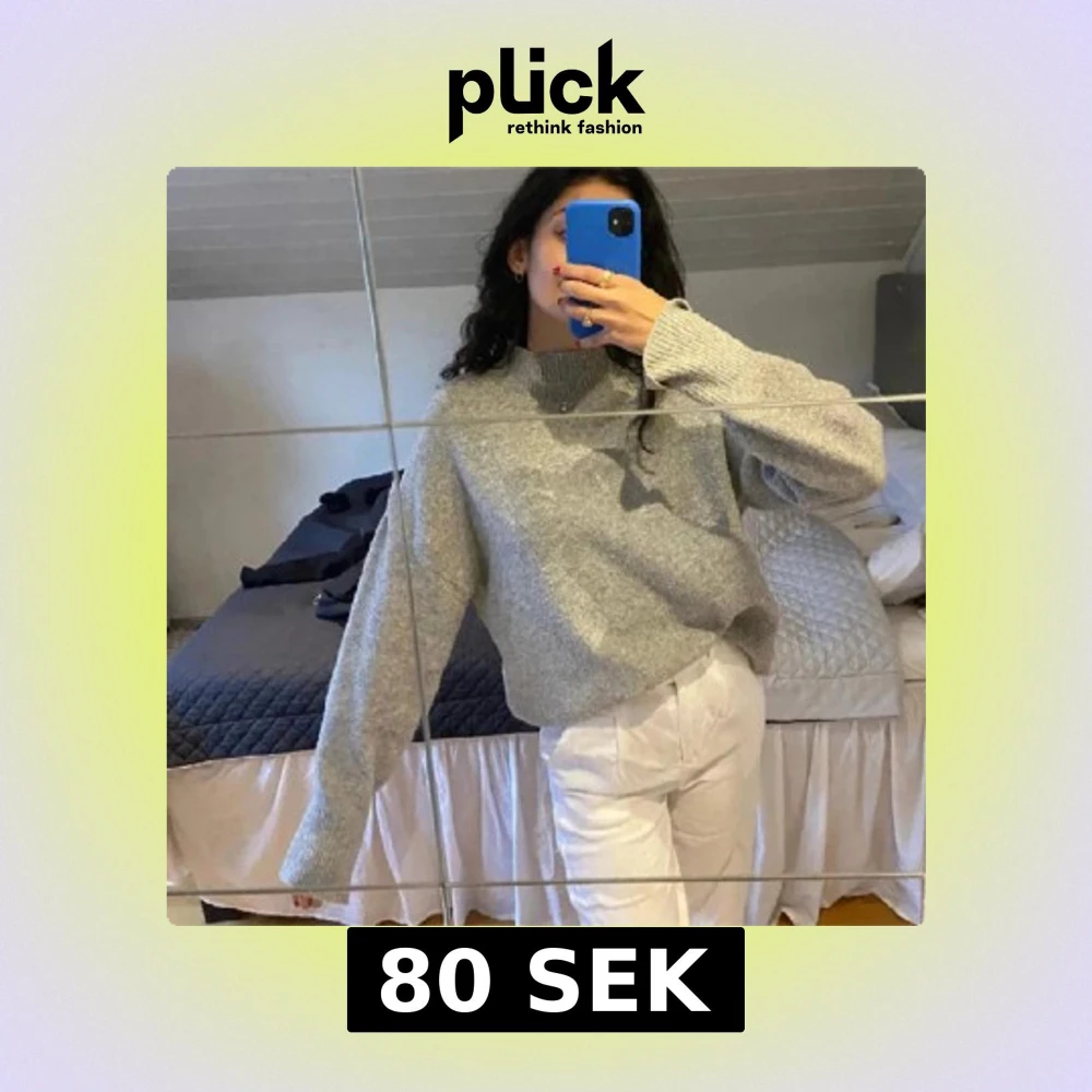 Säljer en mysig grå stickad tröja med en avslappnad passform. Tröjan har långa ärmar och en klassisk rund halsringning. Perfekt för kyligare dagar.