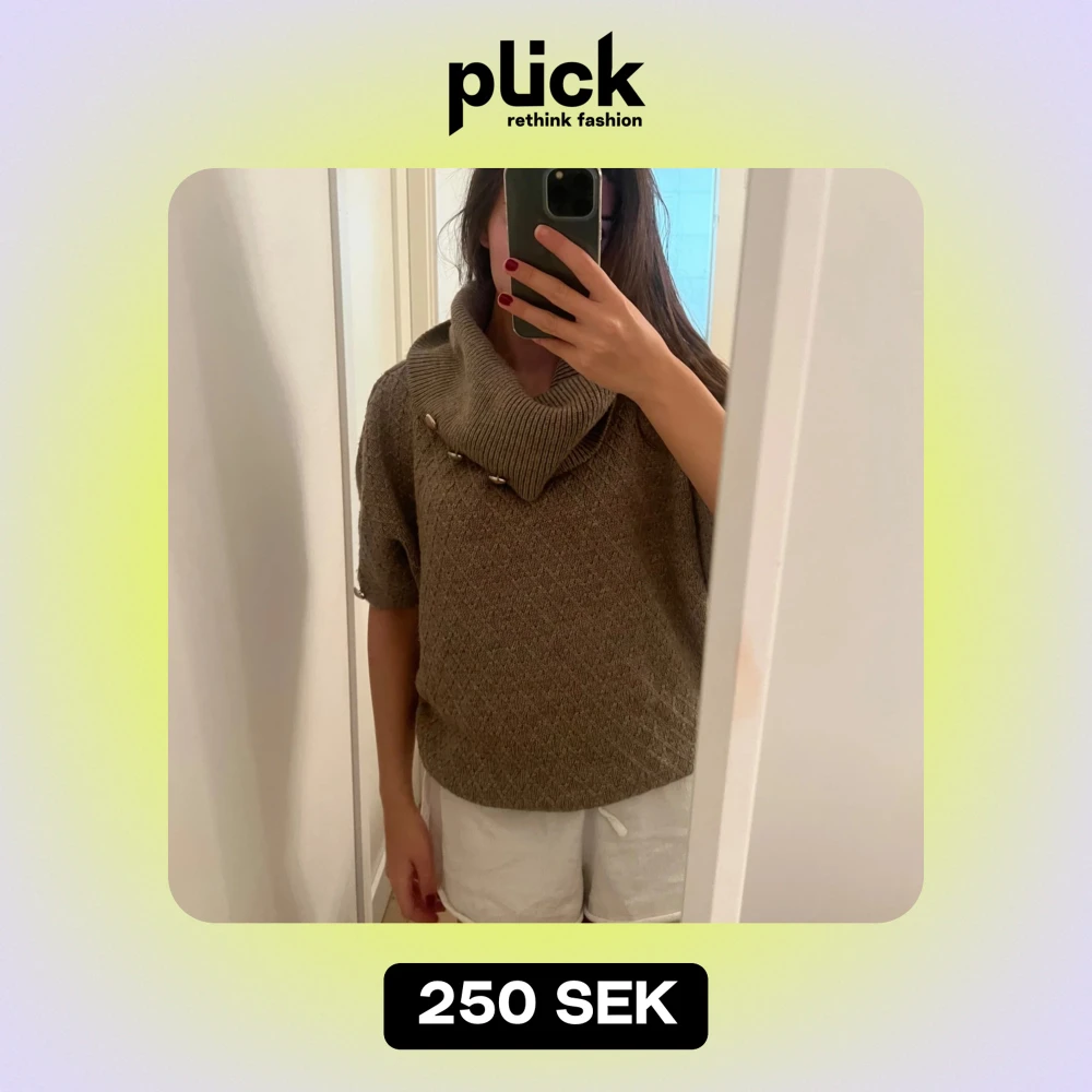 Säljer en supermysig beige stickad tröja med en stor krage och dekorativa knappar. Perfekt för höst och vinter! Tröjan har korta ärmar och ett diskret mönster som ger den en extra touch. Den är både stilren och bekväm, perfekt för kyliga dagar. 🧶✨