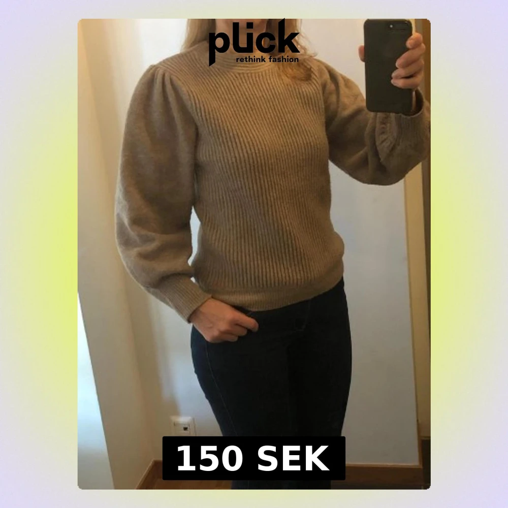 Säljer en beige stickad tröja från Mango med ribbad struktur och puffiga långärmar. Tröjan har rund hals och breda muddar vid ärmslut och nederkant.