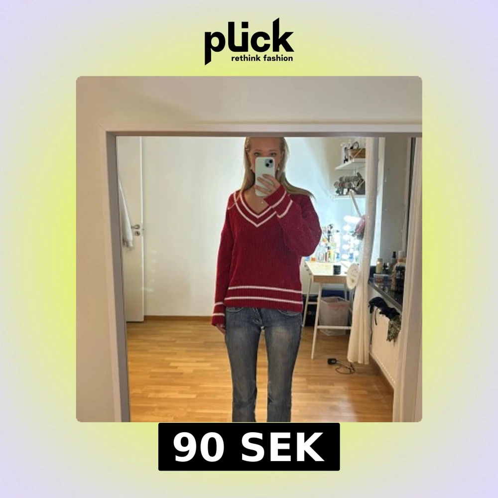 En röd stickad tröja med vita ränder vid halsringningen, ärmsluten och nederkanten. Tröjan har en v-ringad hals och långa ärmar.