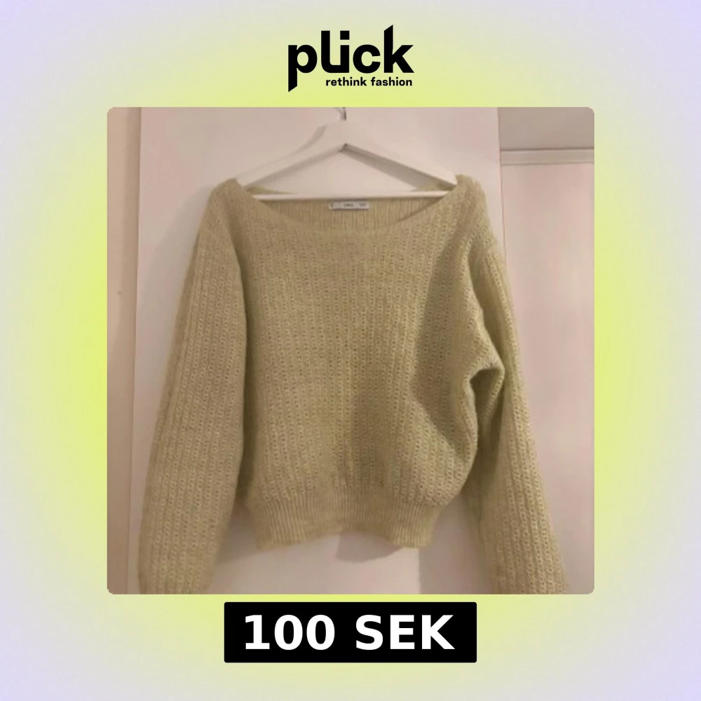 Supermysig ljusgrön stickad tröja från MNG med bred halsringning och lång ärm. Tröjan har ett luftigt stickat mönster och ribbade muddar vid ärmslut och nederkant. Produkten ser mer gul ut på bilden men i verkligheten är den mer grön.
