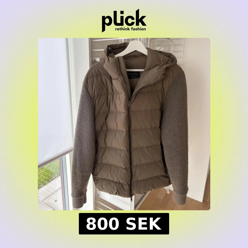 Säljer en brun pufferjacka från Massimo Dutti med stickade ärmar och huva. Jackan har dragkedja framtill och quiltad kropp, vilket ger en schysst kontrast mellan material. Perfekt för dig som gillar en chill och snygg look under höst och vinter.