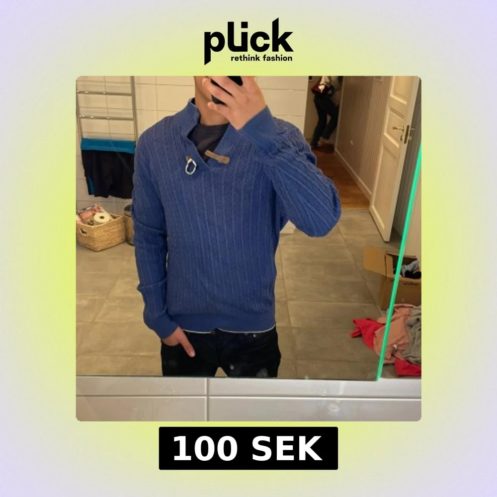 Säljer en elegant blå stickad tröja från Massimo Dutti. Tröjan har en unik knäppning vid halsen och är tillverkad i kashmirblandning för extra komfort. Perfekt för kyliga dagar! Pris kan diskuteras