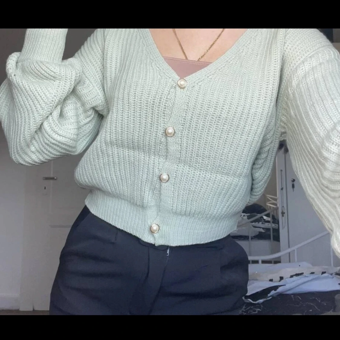 Jättefin stickad kofta i mint grön. Använd endast en gång. Storlek S.