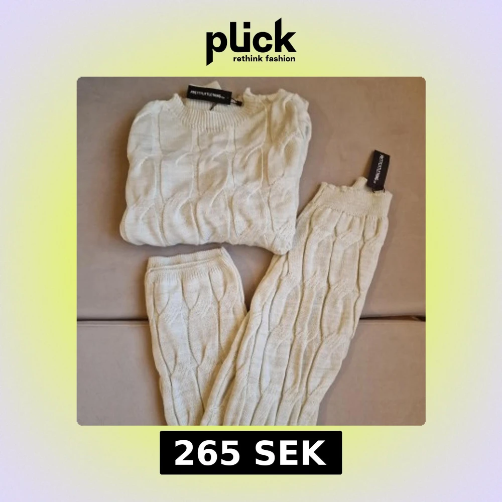 Stickad set med tröja och byxor i fint flätat mönster från PrettyLittleThing. Storlek 38 på båda men passar mig som har S så liten M lr S. Mysigt nu till hösten 🍂🍁