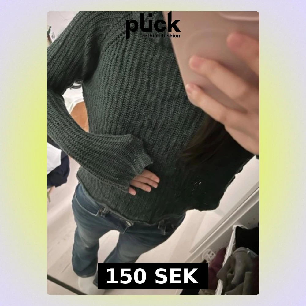 Mysig mörkgrön stickad tröja med polokrage och lång ärm. Tröjan har en ribbad struktur och sitter lite loose för en avslappnad look. Perfekt för kyligare dagar och enkel att styla med jeans eller kjol. På båda sidorna så finns det hål för snygga stil och ger coolare vibe.