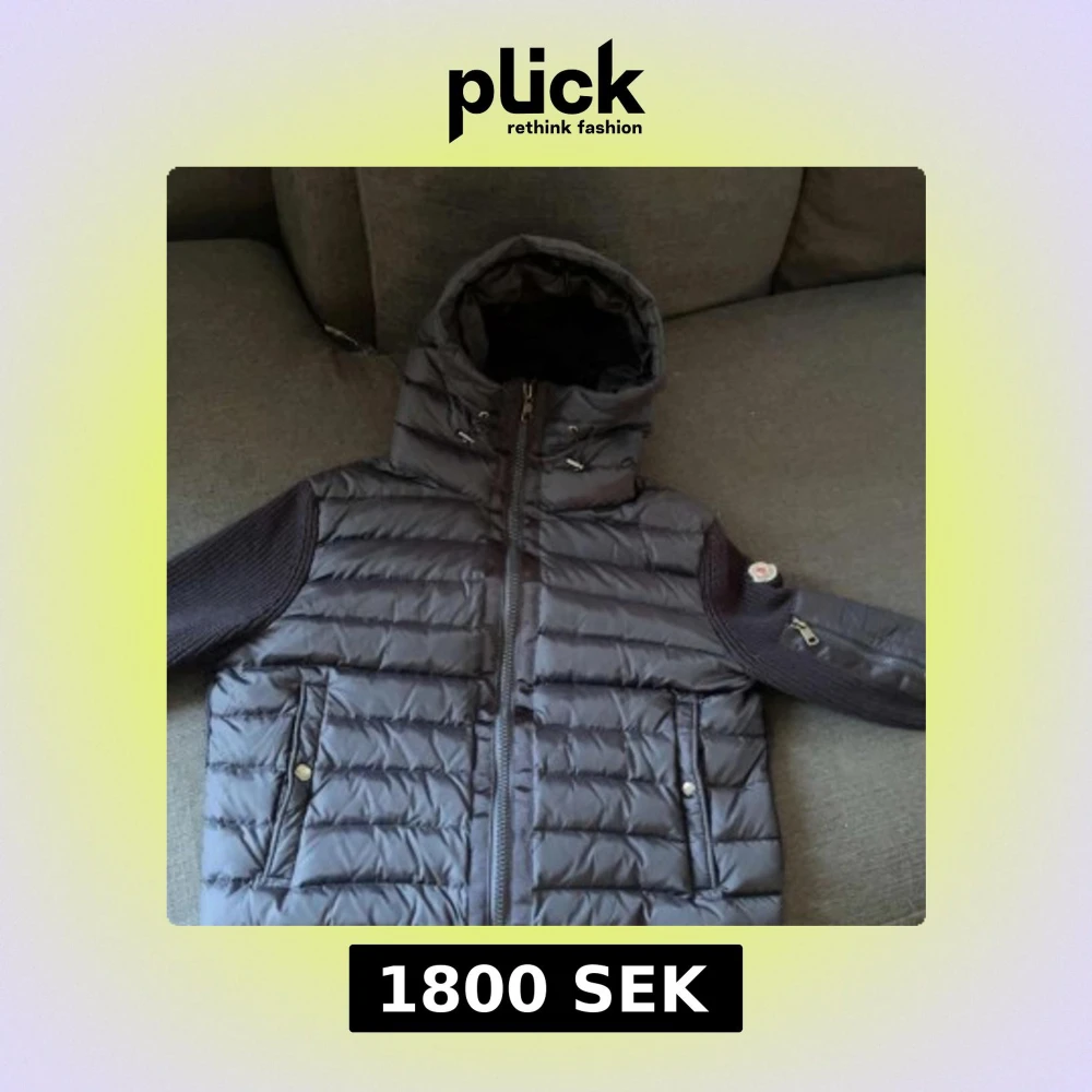 Säljer en svart pufferjacka från Moncler med stickade ärmar och dragkedja framtill. Jackan har hög krage, huva med snörning och två fickor med tryckknappar. Moncler-logga på ena ärmen och detaljer i både syntet och stickat material.