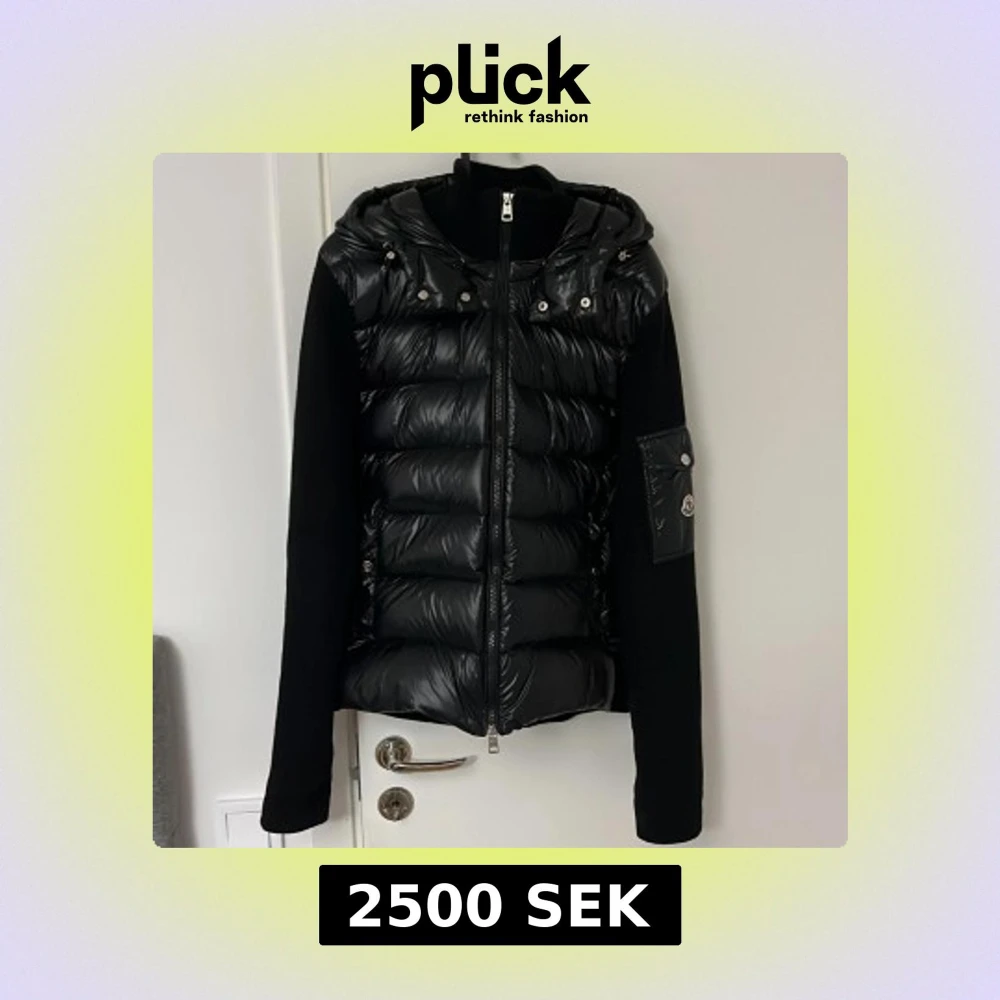 Säljer en svart pufferjacka från Moncler med glansig quiltad front och huva, samt stickade ärmar och rygg. Jackan har dragkedja framtill, snygga detaljer med knappar vid huvan och en ficka med Moncler-logga på ärmen. Perfekt för dig som vill ha en stilren och exklusiv look.