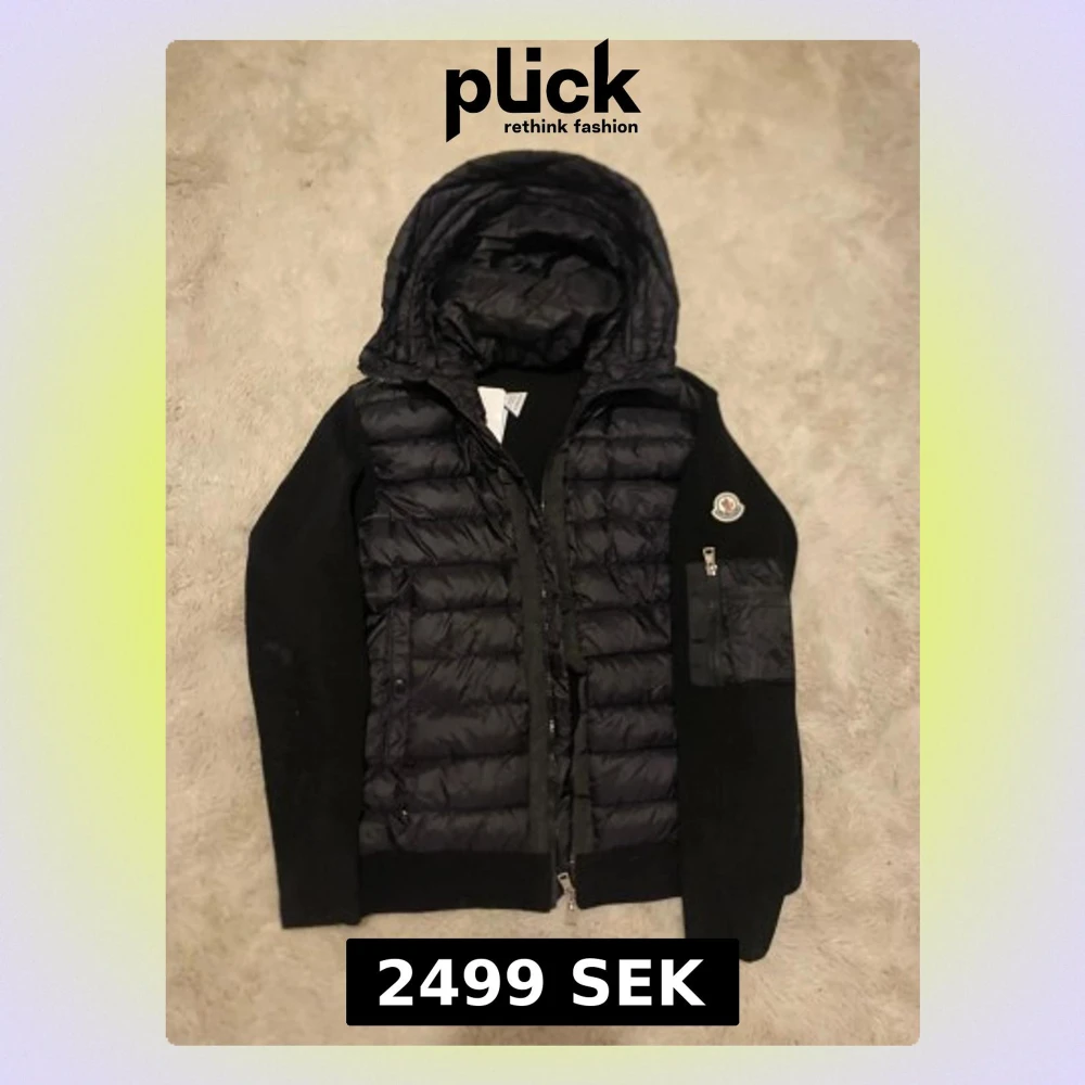 Svart pufferjacka från Moncler med stickade ärmar och quiltad front. Jackan har en stor huva, dragkedja framtill och en ficka med dragkedja på ärmen. Moncler-logga på vänster ärm. Perfekt för dig som gillar exklusiva streetwear-vibbar.