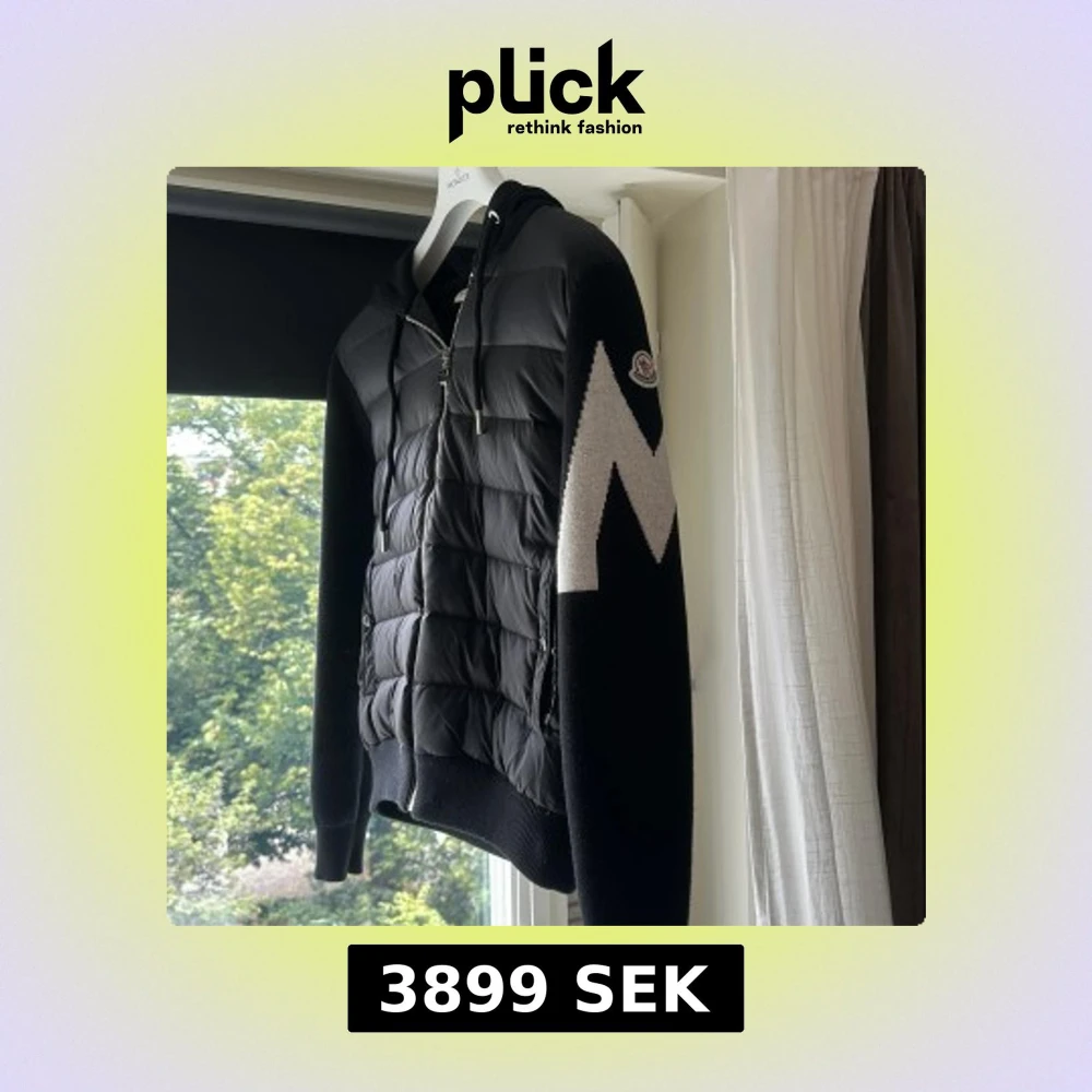Svart hoodie från Moncler med vadderad, quiltad front i syntet och stickade ärmar. Stor vit M-detalj på ena ärmen och klassisk Moncler-logga. Huva med snörning och dragkedja framtill. Perfekt för kyliga dagar och riktigt snygg streetstil.