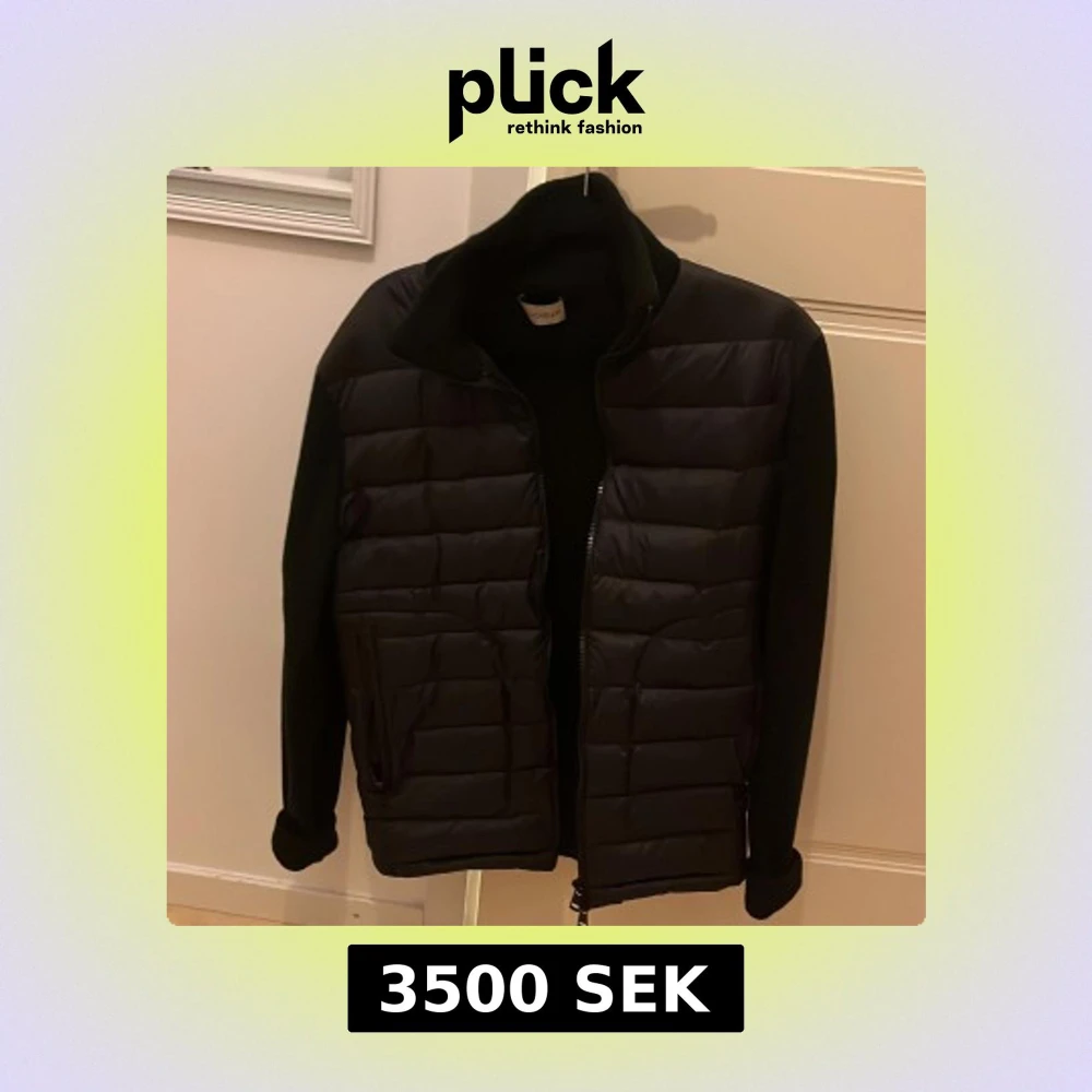 Svart Moncler jacka med quiltad front och ärmar i stickad kvalitet. Jackan har hög krage, dragkedja framtill och Moncler-logga på ena ärmen. Snygg och stilren design som passar perfekt till höst och vinter. Använd 2-3 gånger, är i nyskick!