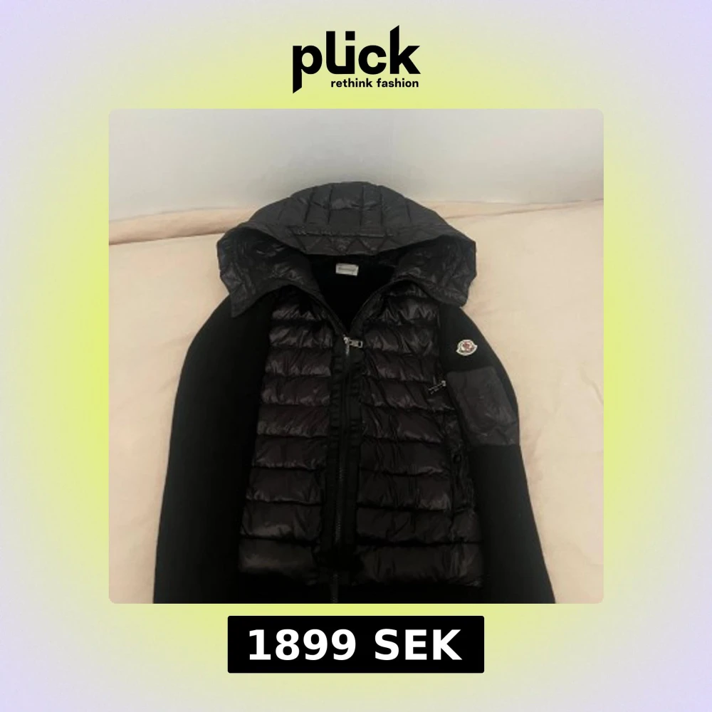 Snygg svart pufferjacka från Moncler med stickade ärmar och quiltad front. Jackan har huva, dragkedja och en liten ficka med Moncler-logga på ärmen. Perfekt för dig som vill ha en stilren och sportig look.