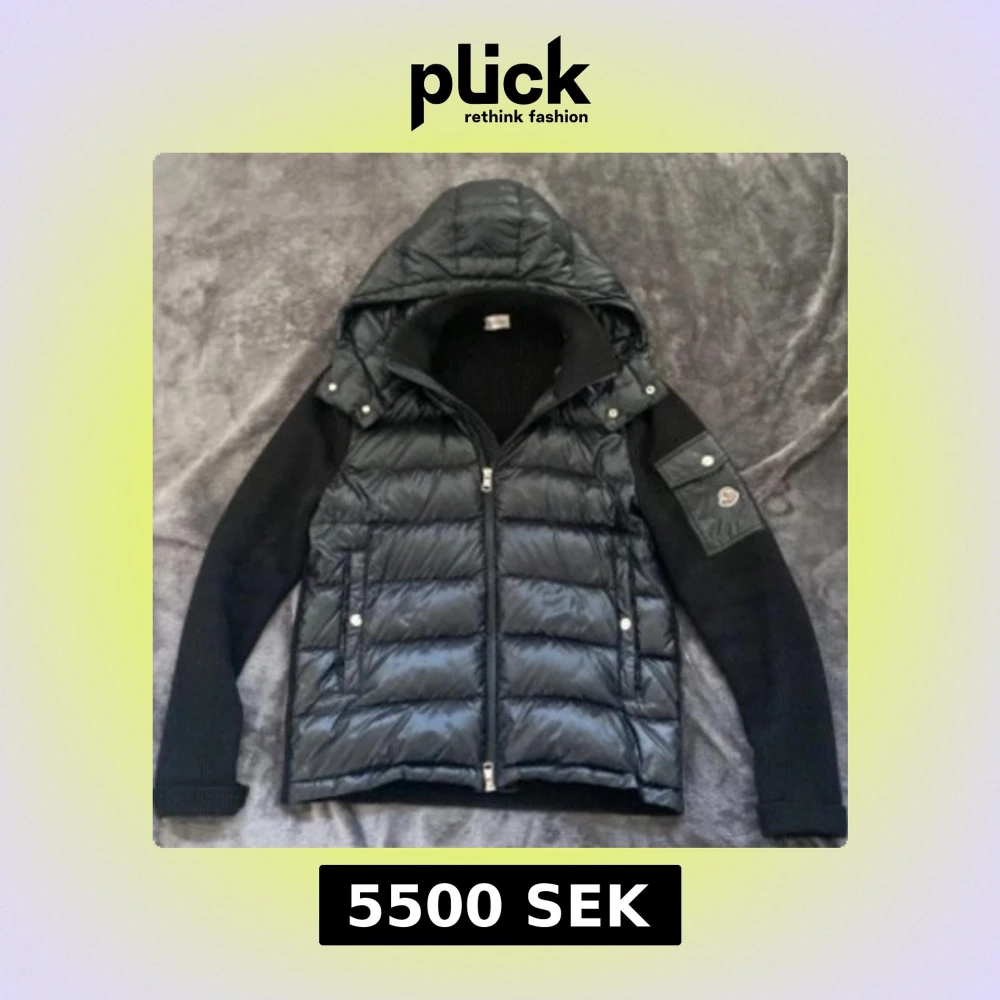 Svart pufferjacka från Moncler med stickade ärmar och huva. Jackan har quiltad front i glansigt material, dragkedja framtill och en ficka med Moncler-logga på ärmen. Perfekt för kalla dagar och riktigt snygg streetstil.