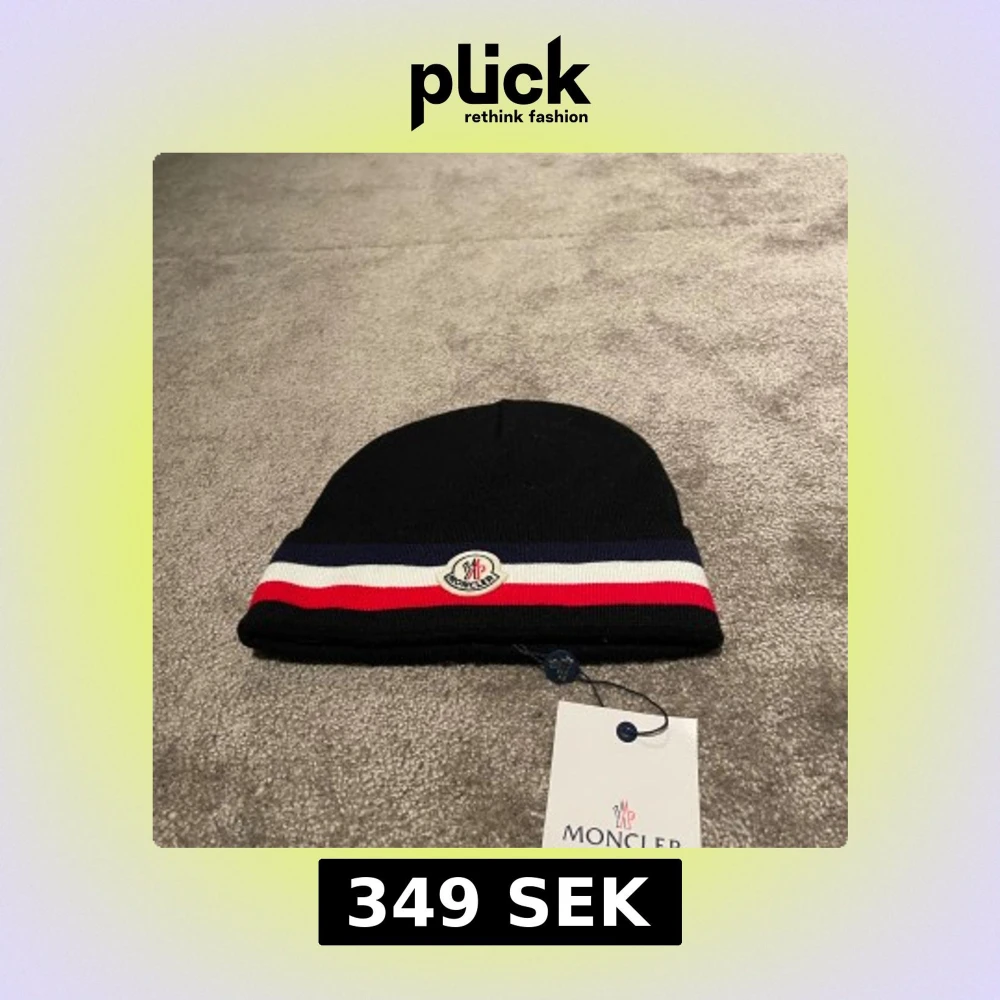 Snygg svart mössa från Moncler med klassiska ränder i marinblått, vitt och rött runt kanten. Mössan har Moncler-logga framtill och är stickad i mjukt material som håller dig varm. Perfekt accessoar för att lyfta din look under kyliga dagar.