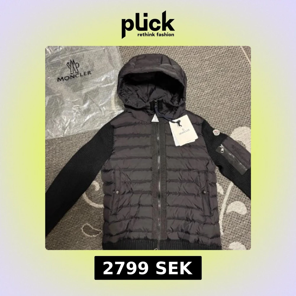 Snygg svart pufferjacka från Moncler med stickade ärmar och vadderad kropp. Bästa priserna här på Plick och skicka gärna in bud då jag kan sänka priset vid snabb affär.