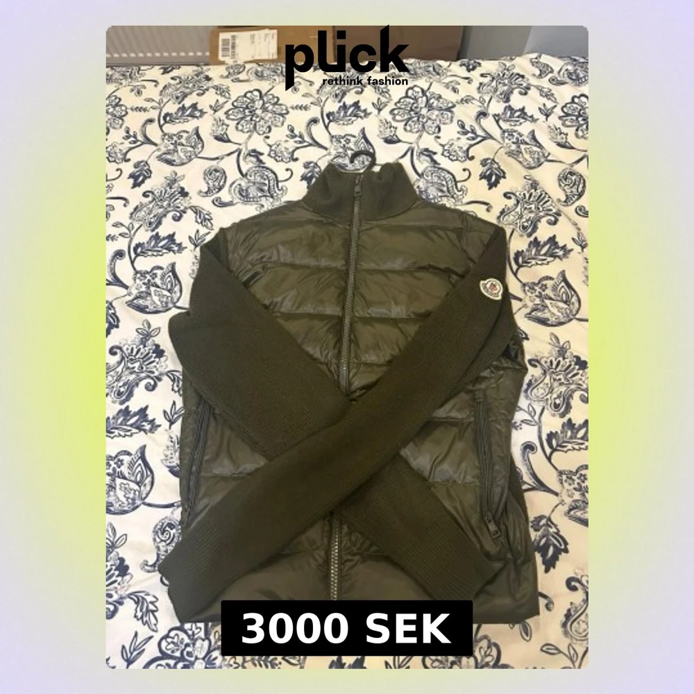 Snygg olivgrön pufferjacka från Moncler med stickade ärmar och hög krage. Jackan har dragkedja framtill och sidofickor med dragkedja. Moncler-logga på ärmen och quiltad front i syntetmaterial. Perfekt för dig som vill ha en clean och modern look.