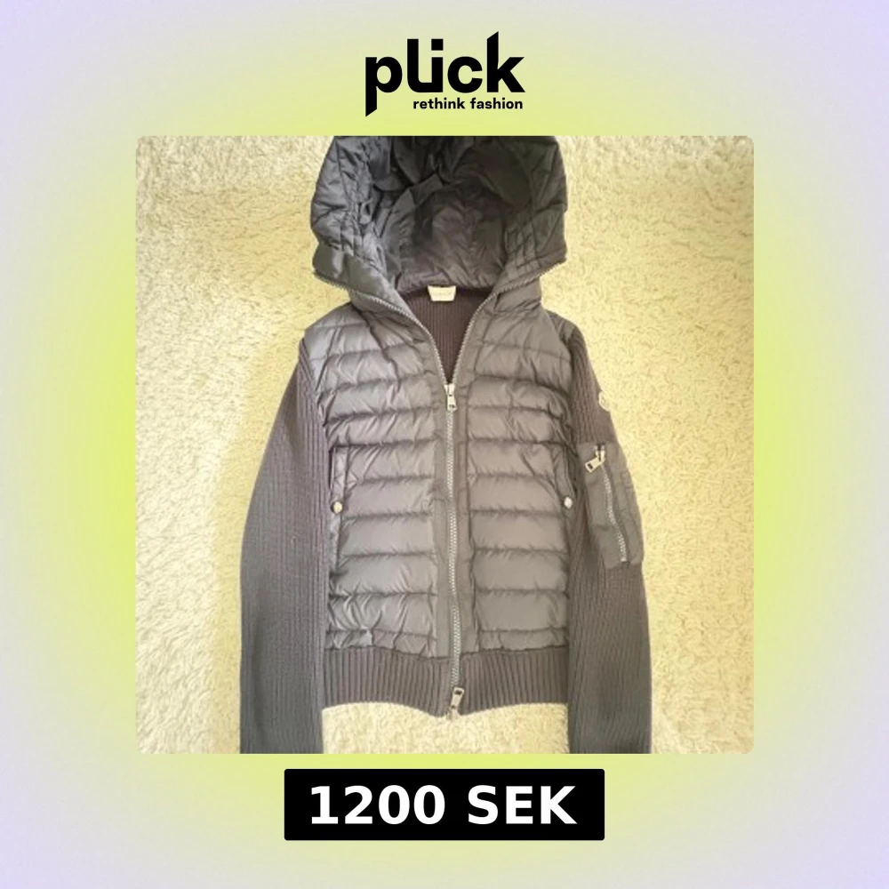 Snygg grå pufferjacka från Moncler med stickade ärmar och rygg. Jackan har huva, dragkedja framtill och en extra ficka med dragkedja på ärmen. Perfekt för dig som vill ha en sportig men ändå clean look.