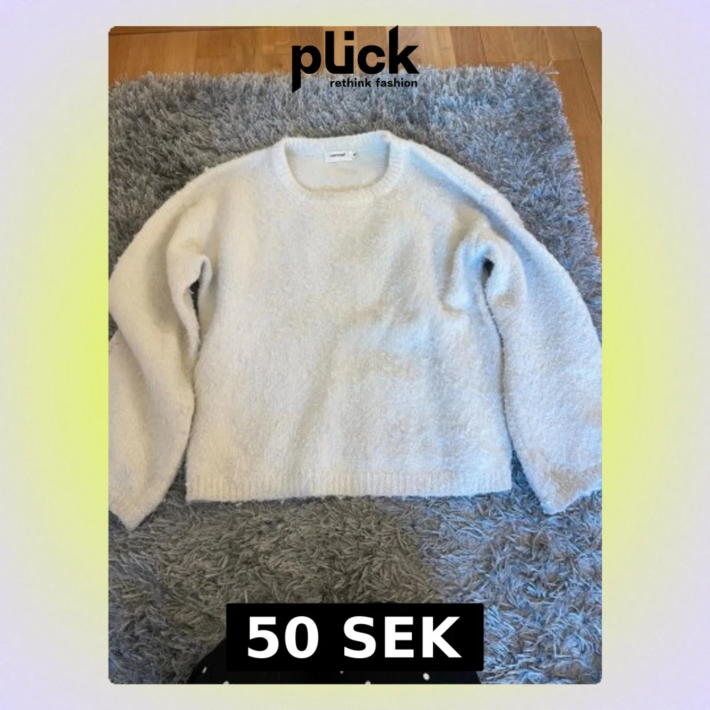 Mysig vit stickad tröja från Missäy med rund halsringning och lång ärm. Tröjan är fluffig och har en avslappnad passform, perfekt för kalla dagar. Storlek M och passar S fint