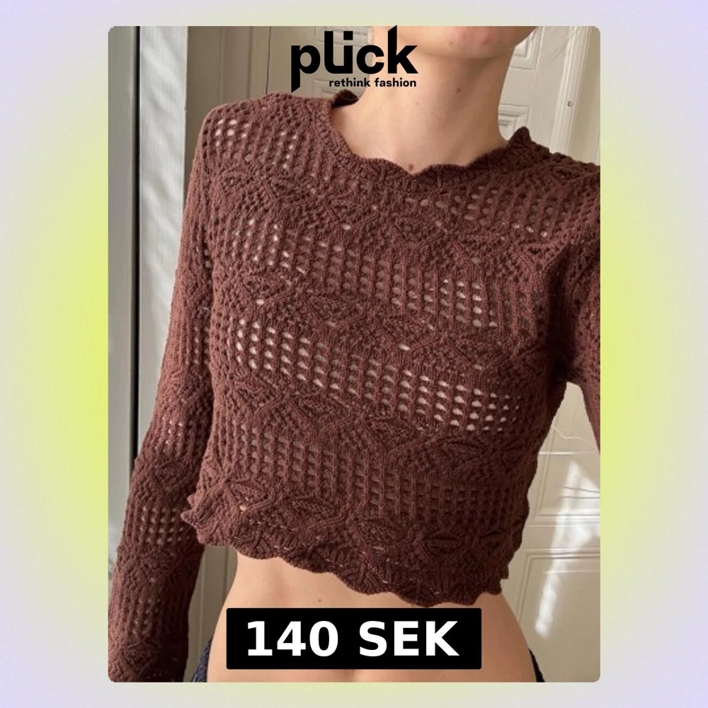 Säljer en brun långärmad croptröja med virkat mönster och vågig nederkant.