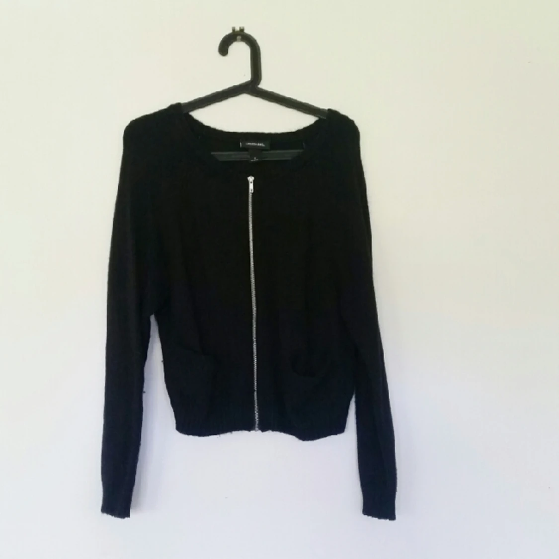 Svart stickad midjekort kofta med dragkedja och fickor. Mjuk men lite nopprig.