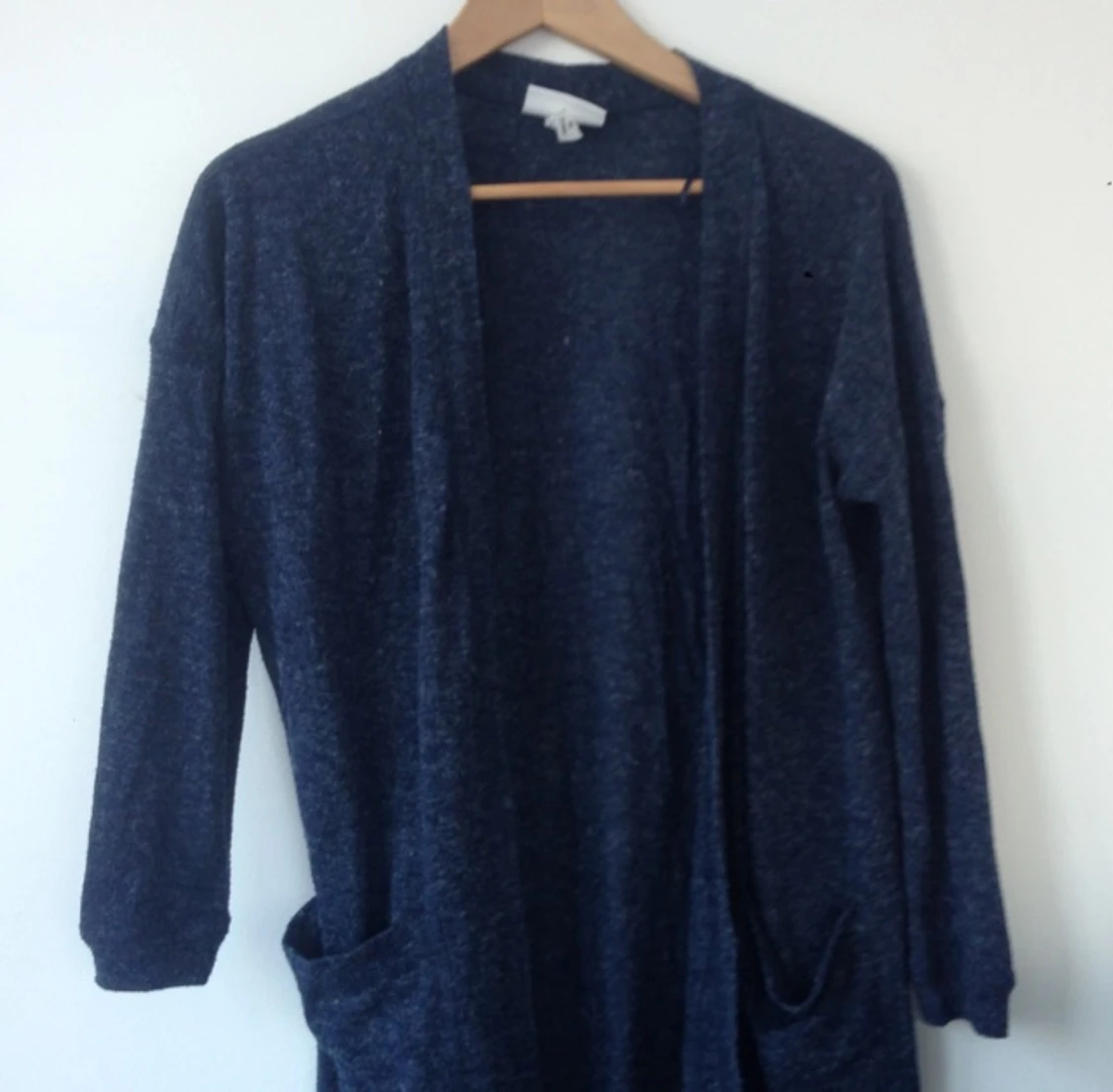 En lång mörkblå supermysig kofta från Monki som passar xsmall, small och medium (beroende på hur lång/kort man vill ha den)