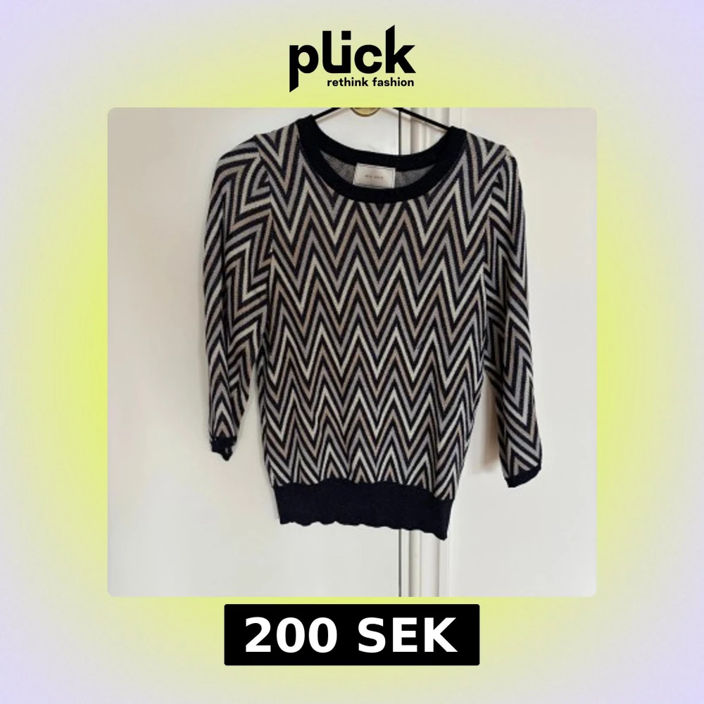 Snygg stickad tröja från Neo Noir med blå och beige zigzag-mönster. Tröjan har rund halsringning, trekvartsärm och ribbade muddar.