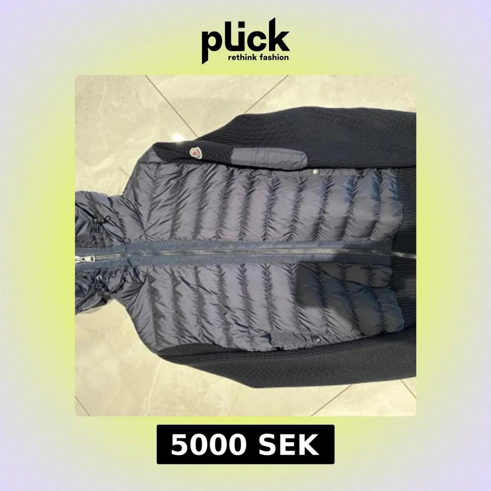 Snygg mörkblå pufferjacka/ cardigan från Moncler med stickade ärmar och huva. Jackan har dragkedja framtill, fickor med knappar och en extra ficka med dragkedja på ärmen. Perfekt för kyliga dagar och ger en sportig look pris 5500 kom med bud då kvitto o allt medkommer.