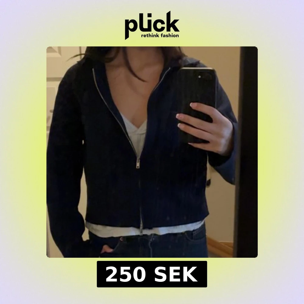 Mörkblå stickad jacka från Åhléns med två stora fickor framtill och silverfärgad dragkedja. Jackan är croppad med klassisk krage och lång ärm, perfekt för lager-på-lager. Enkel och stilren design som funkar till många outfits.