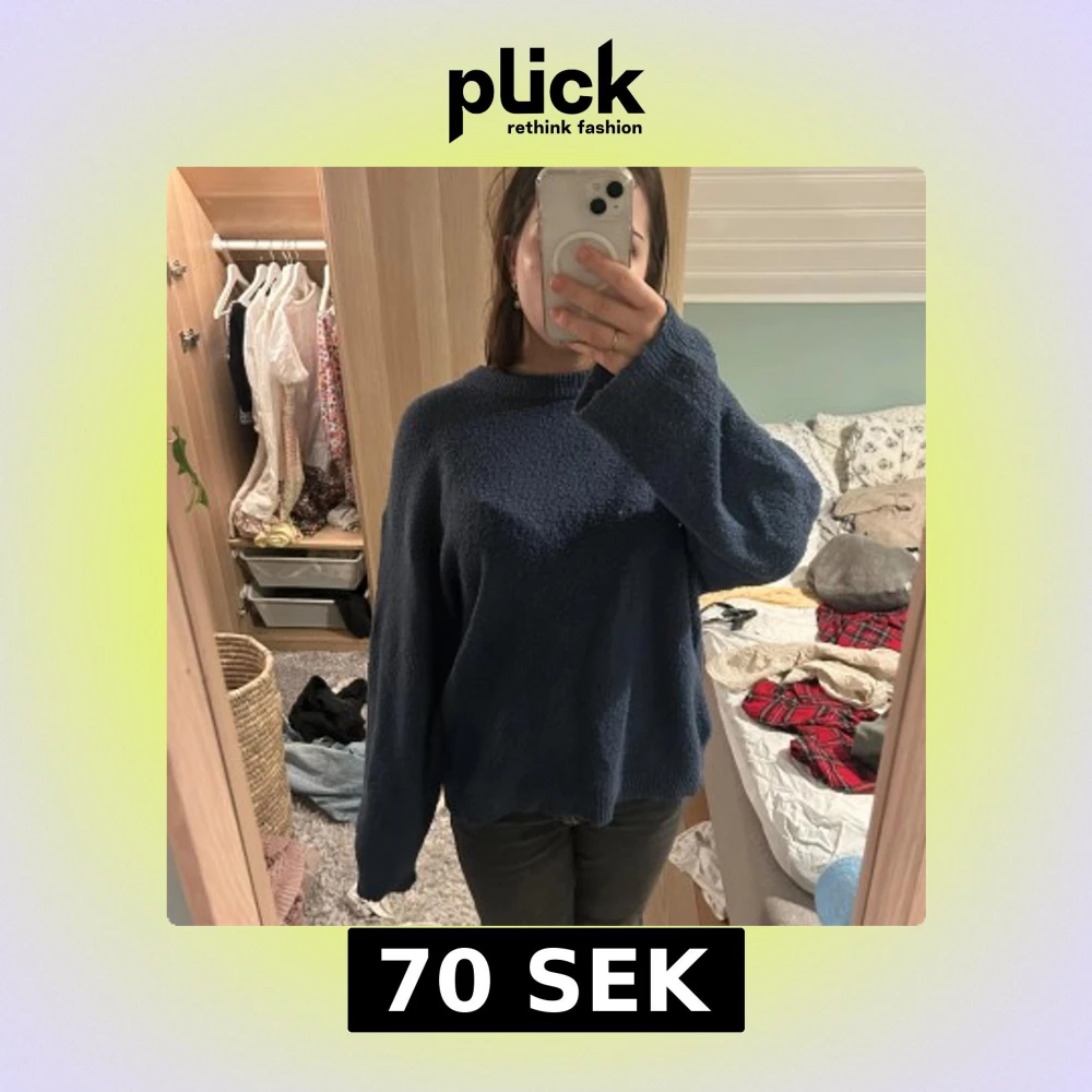 Säljer en mysig mörkblå stickad tröja med normal passform. Tröjan har långa ärmar och en rund halsringning, perfekt för kyligare dagar. Passar bra till både jeans och kjol.