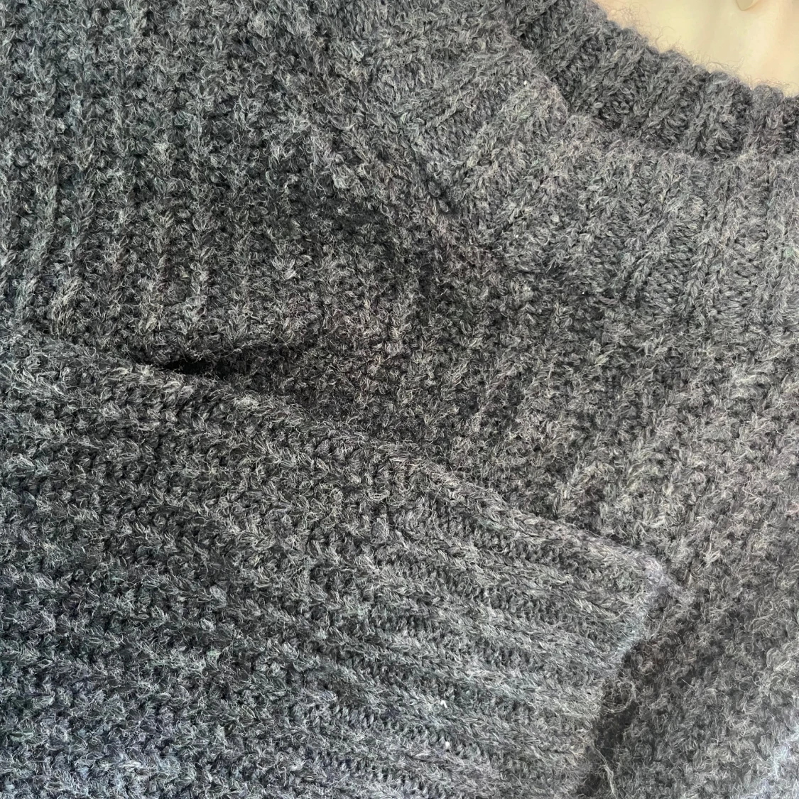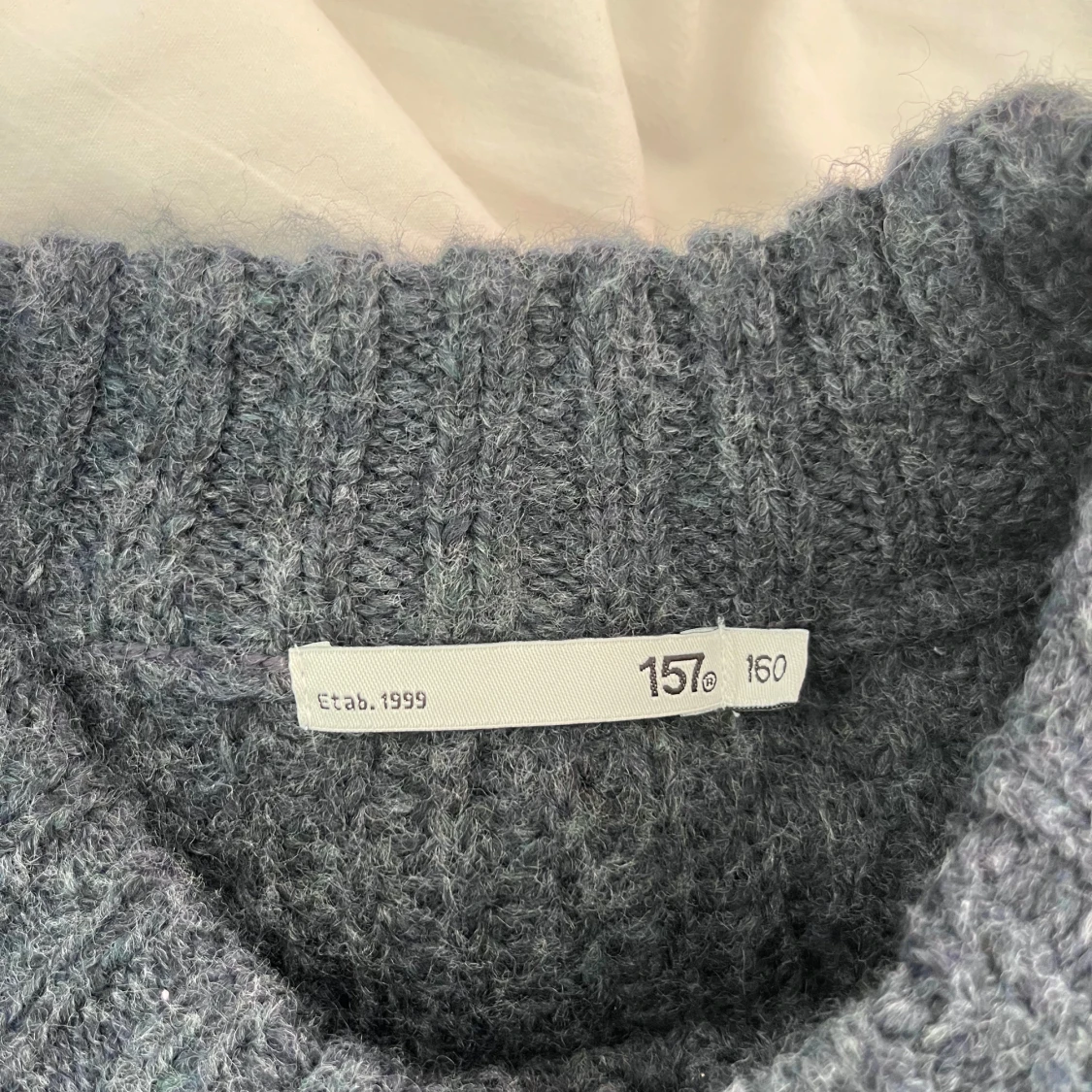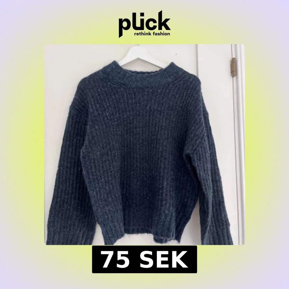 Mysig mörkblå stickad tröja med grov ribbad struktur och högre rund hals. Tröjan är använd ett par gånger men är ändå i väldigt fint skick. Jag skulle säga att tröjan är lite större i storleken så passar personer med iallafall storlek XS/S