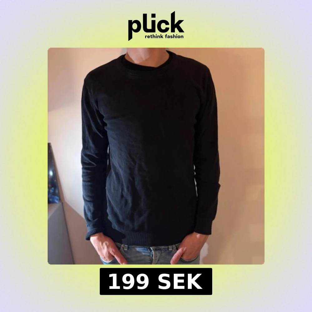 En stilren mörkblå stickad tröja från Bläck i storlek M. Tröjan har rund halsringning och långa ärmar, perfekt för lager-på-lager. Enkel och klassisk design som funkar till många olika outfits.