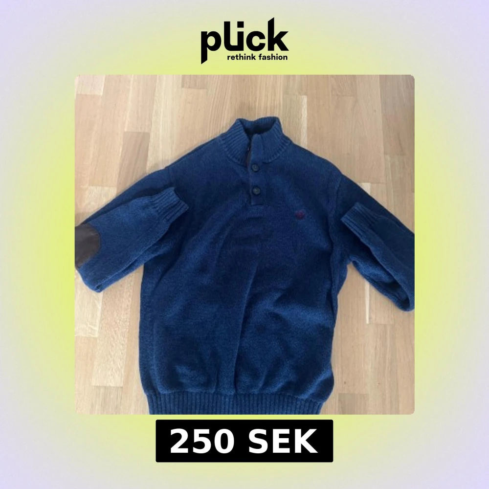 Mörkblå stickad tröja från Chaps med ribbad krage och tre knappar framtill. Tröjan har förstärkta armbågar i brunt tyg och en broderad logga på bröstet. Perfekt för kyliga dagar och riktigt snygg till jeans.
