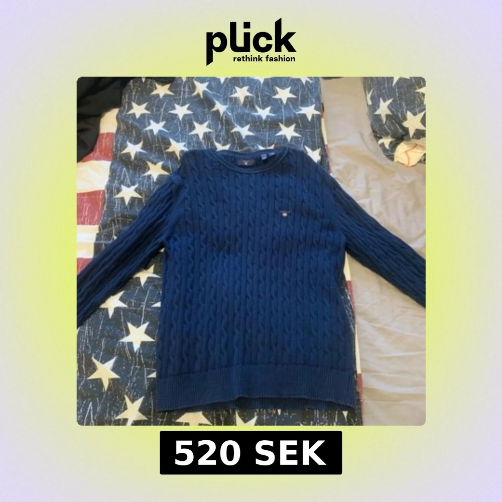 Säljer en snygg mörkblå stickad tröja från GANT. Tröjan har ett klassiskt flätmönster och rund halsringning. Perfekt för kyligare dagar. Passar både till jeans och chinos för en stilren look.