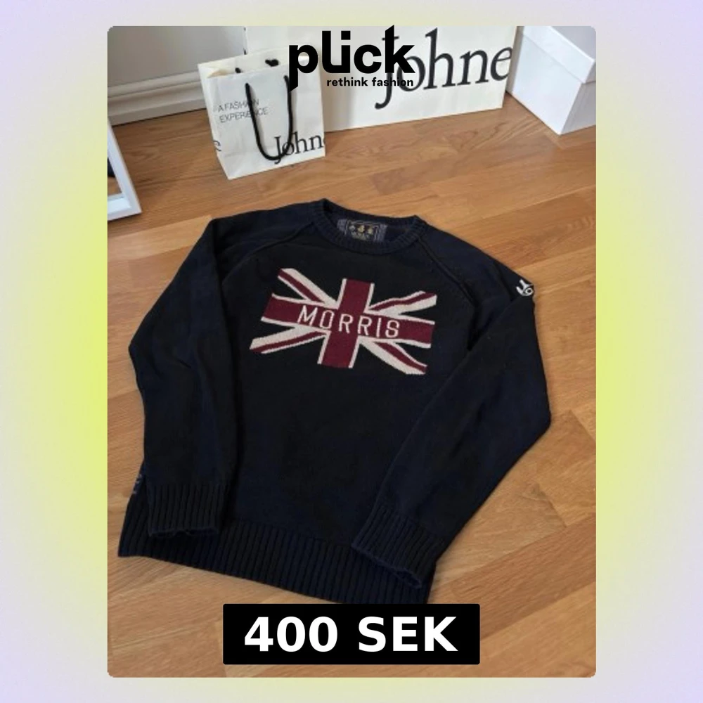 Snygg mörkblå/svart stickad tröja från Morris med Union Jack-flagga i vinrött, vitt och grått på bröstet samt Morris-logga. Tröjan har rund halsringning, ribbade muddar och är perfekt för dig som gillar klassisk brittisk stil.