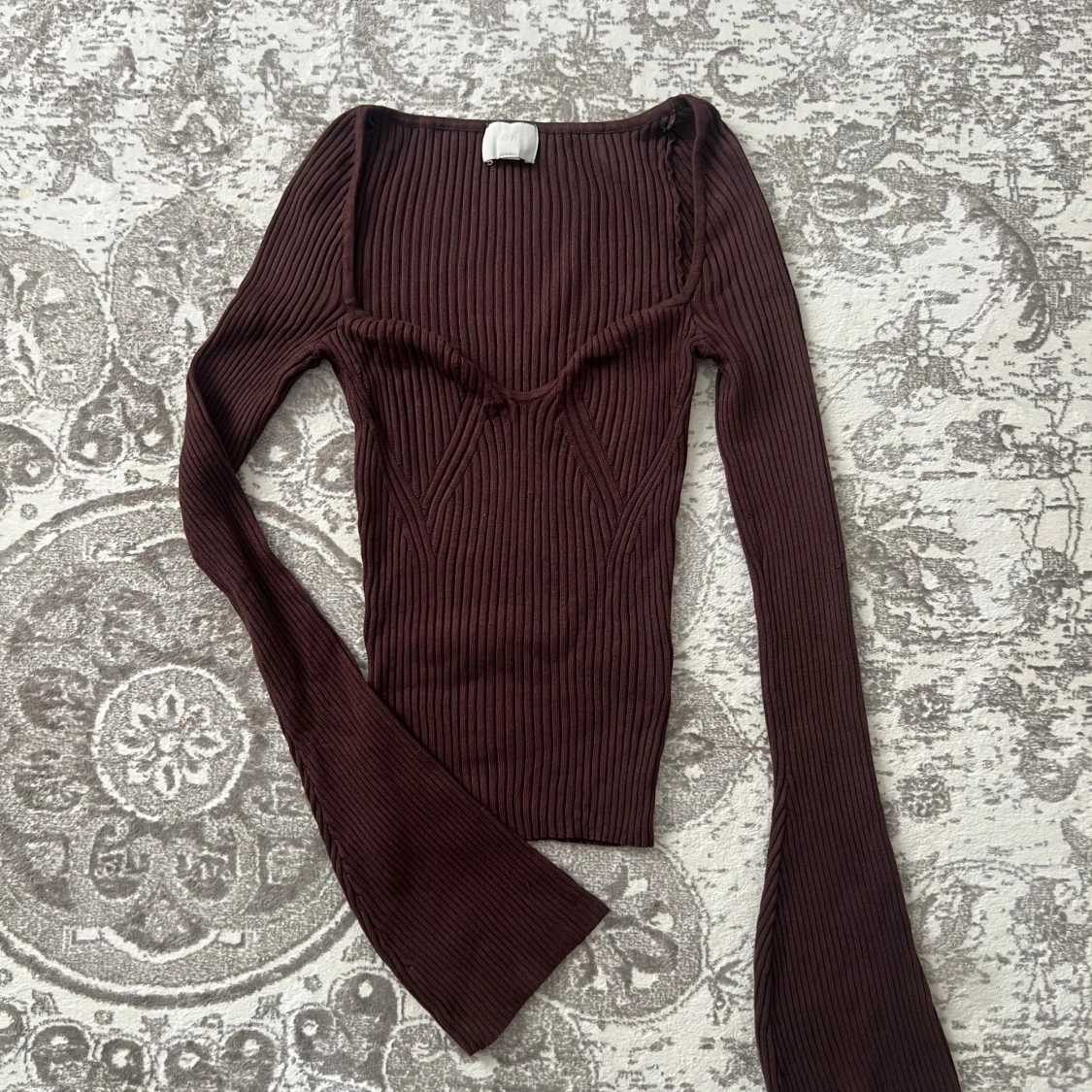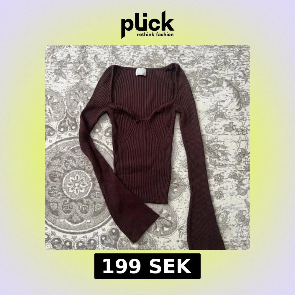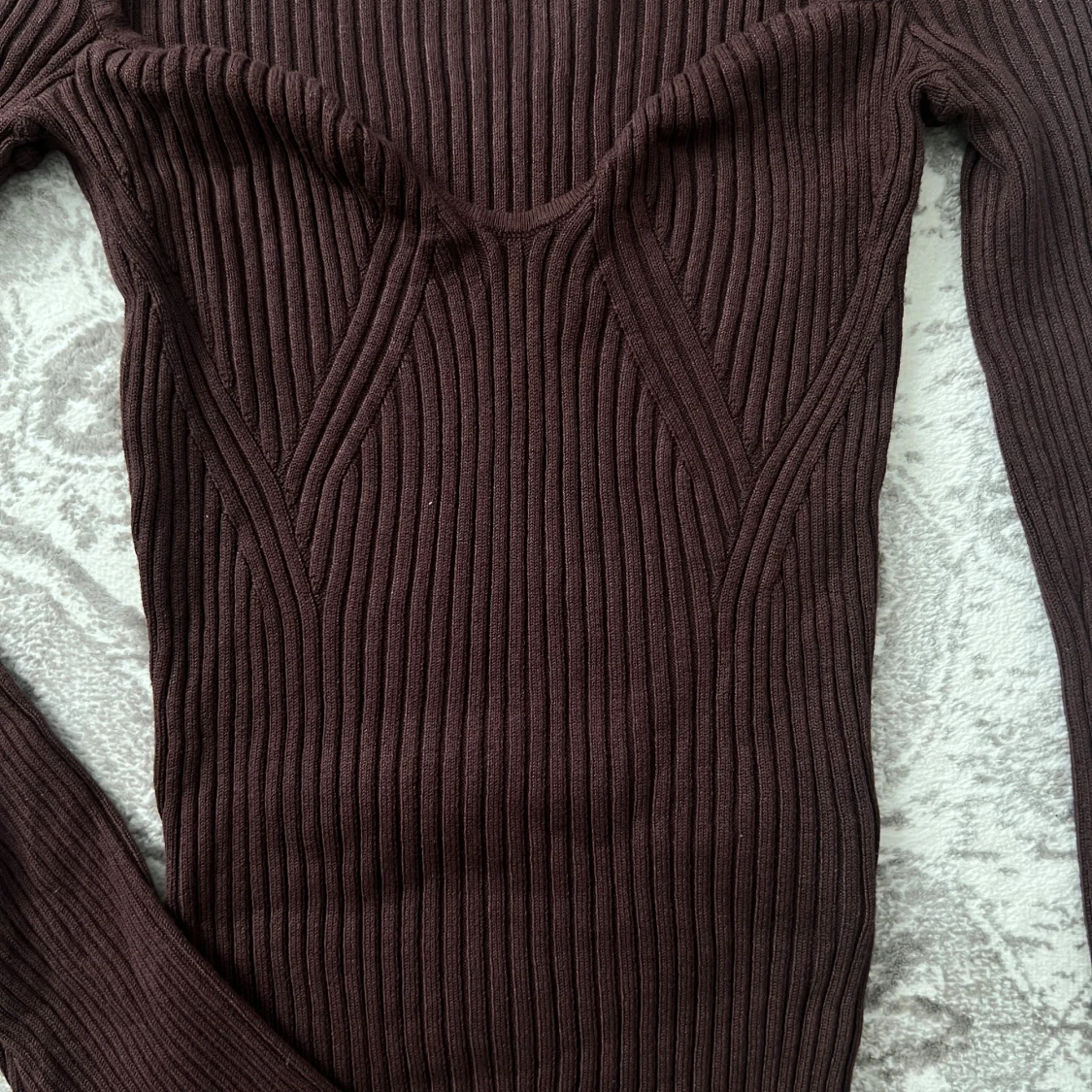 Säljer en mörkbrun ribbad topp med lång ärm och snygg v-ringad detalj vid bysten. Toppen har en slim passform och är tillverkad i ett stretchigt stickat material som sitter riktigt snyggt. Perfekt för en höstoutfit med kjol