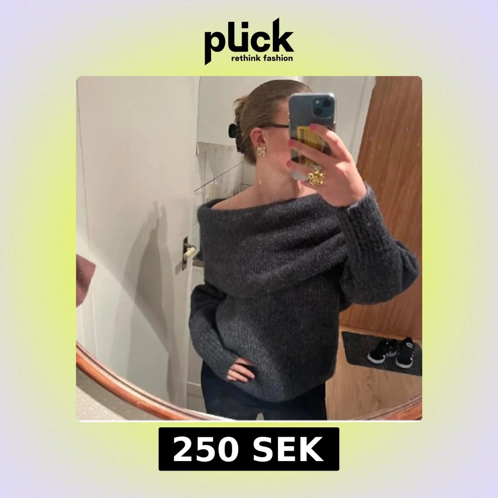 Mysig mörkgrå stickad tröja, offshoulder. Tröjan är i strl M men sitter mer som en S💕knappt använd så är k fint skick.😊