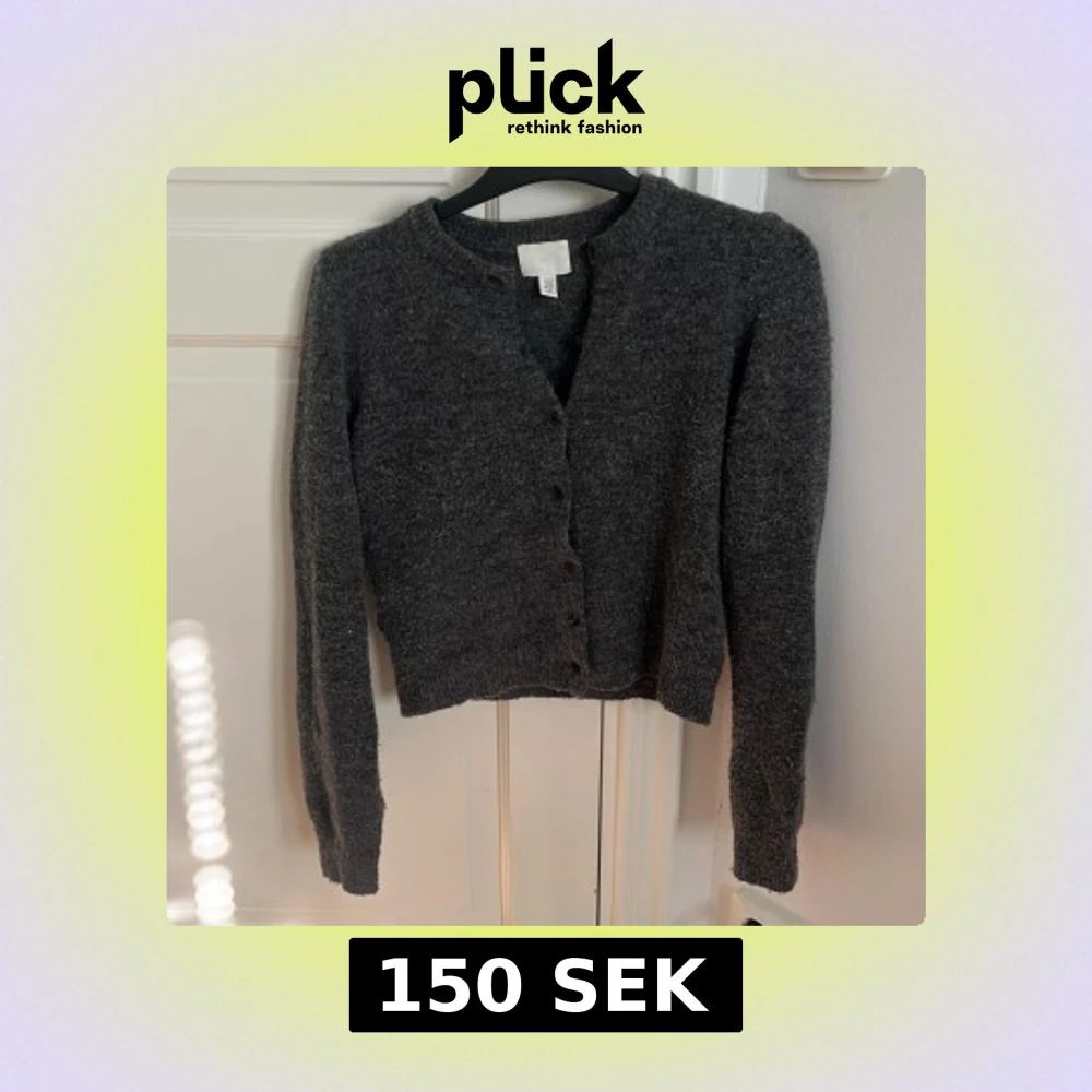 Mysig mörkgrå stickad kofta från H&M med rund halsringning och knappar framtill. Tröjan är croppad och har långa ärmar, perfekt för lager-på-lager under kyliga dagar.