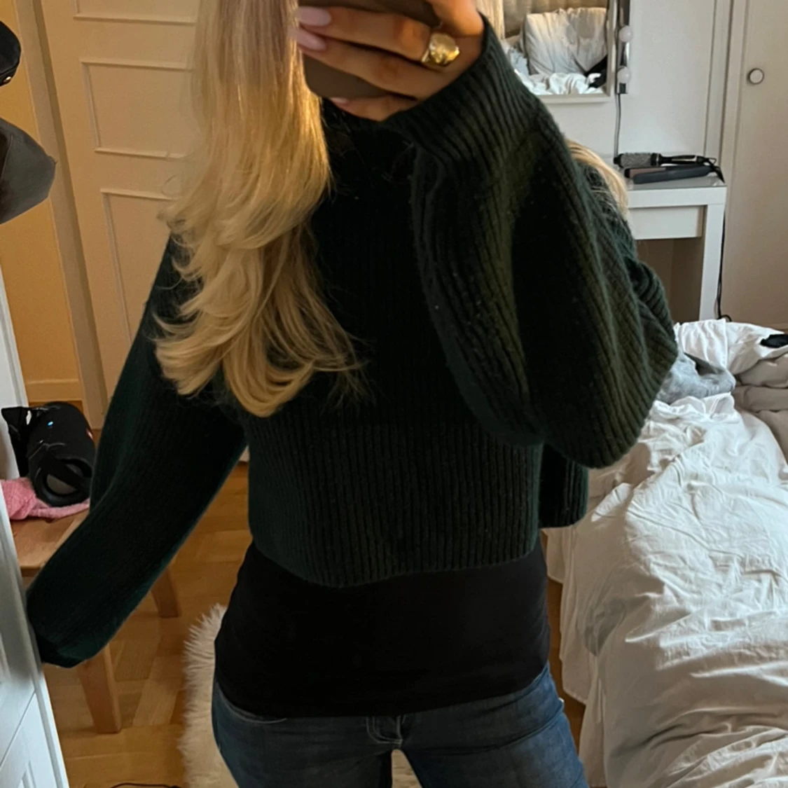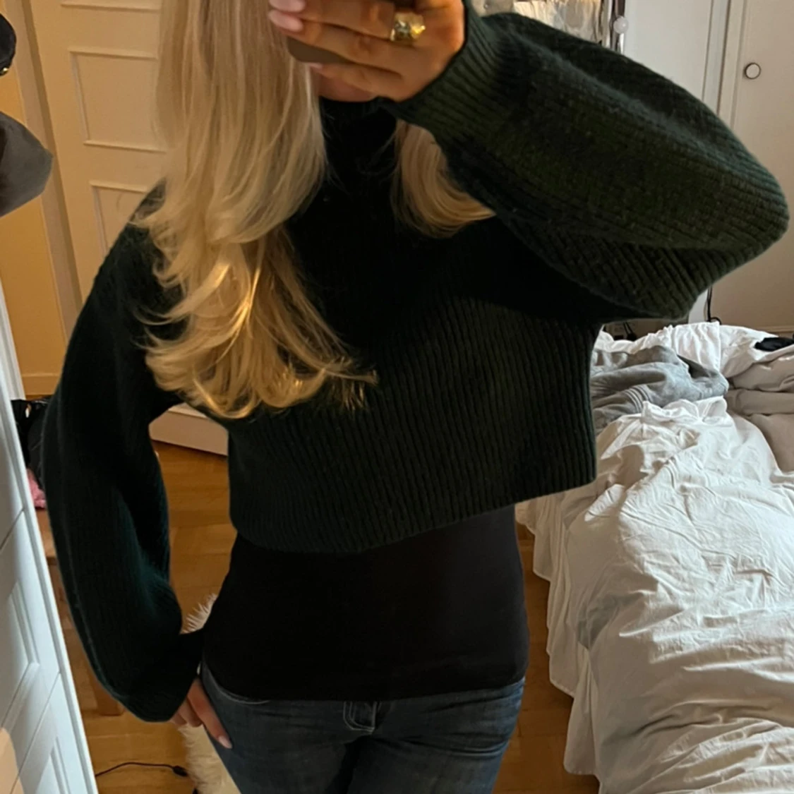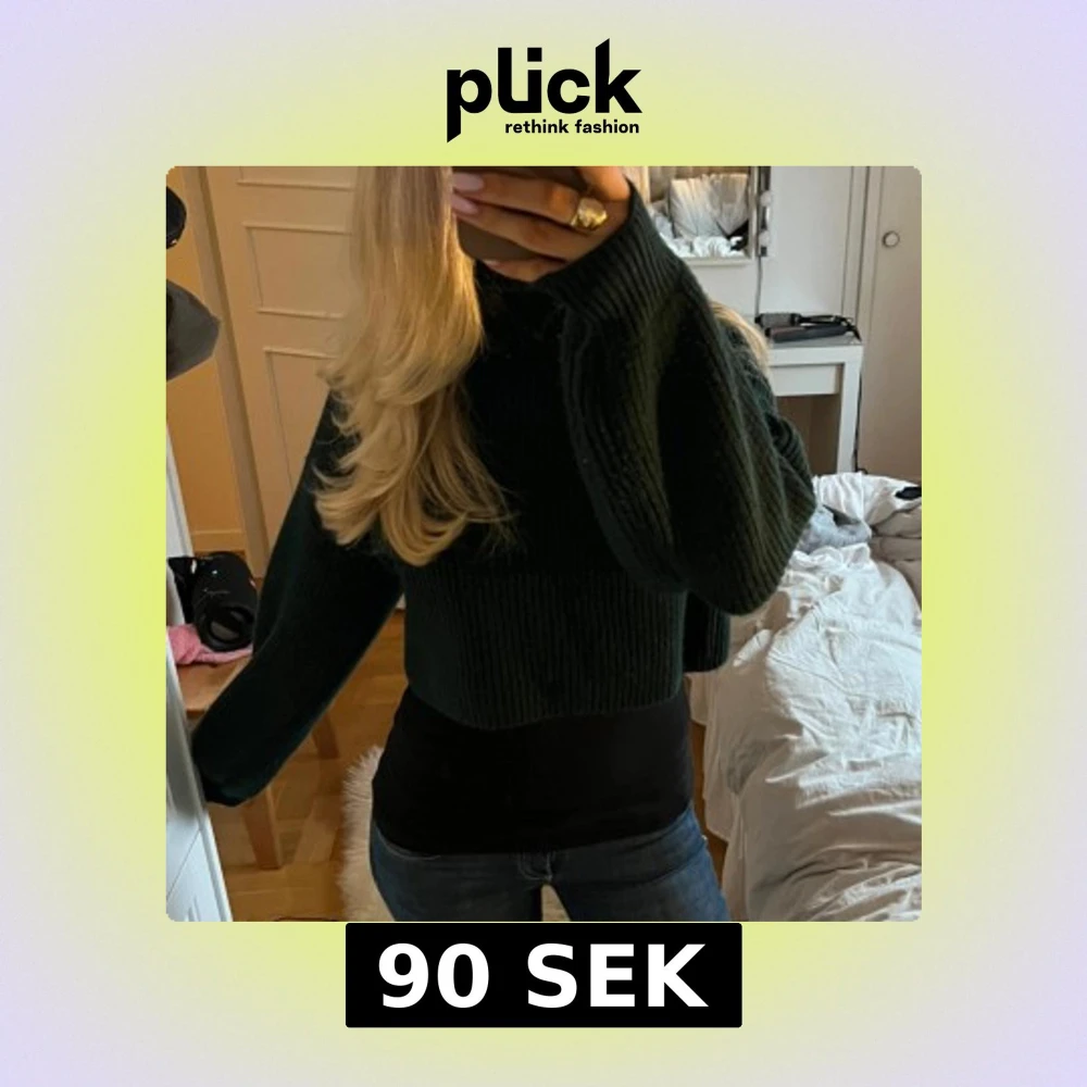 Superfin mörkgrön stickad croppad tröja med långa ärmar. Jättesnyggt med ett tight linne under men går även att ha utan om man gillar det🥰