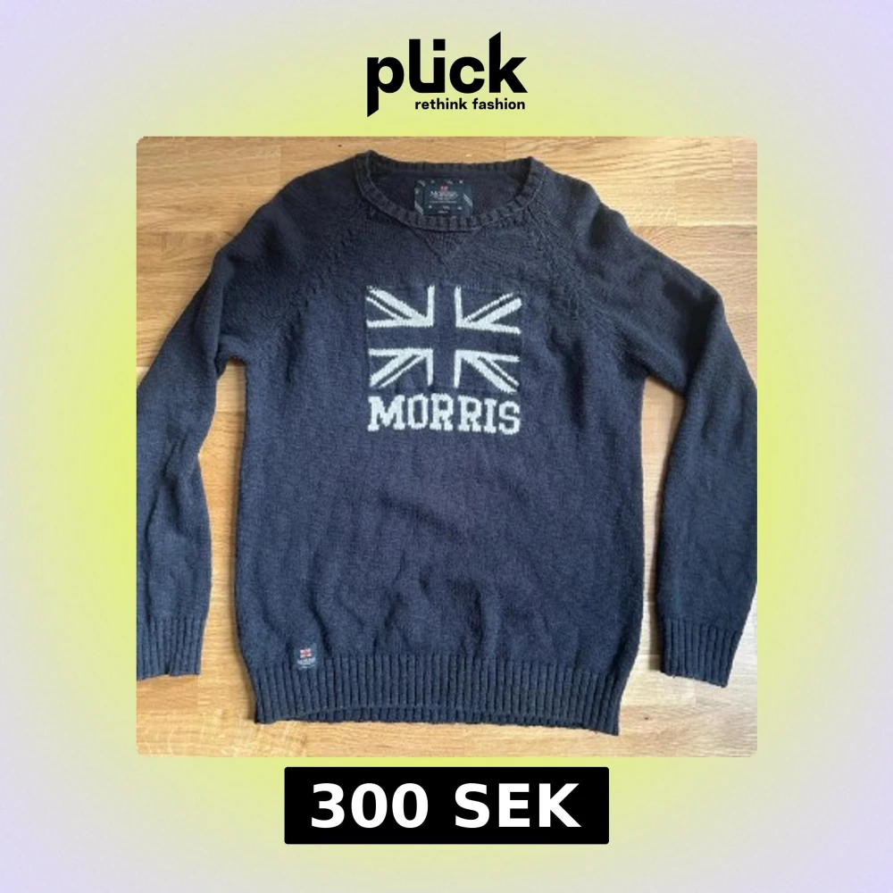Säljer en mörkblå stickad tröja från Morris med ett stort Union Jack-motiv och texten 'Morris' framtill. Tröjan har rund halsringning och långa ärmar med ribbade muddar. Tröjan är storlek L men skulle absolut kunna passa en M då den är lite mer slim. Kom med frågor. Priset är ej hugget i sten!