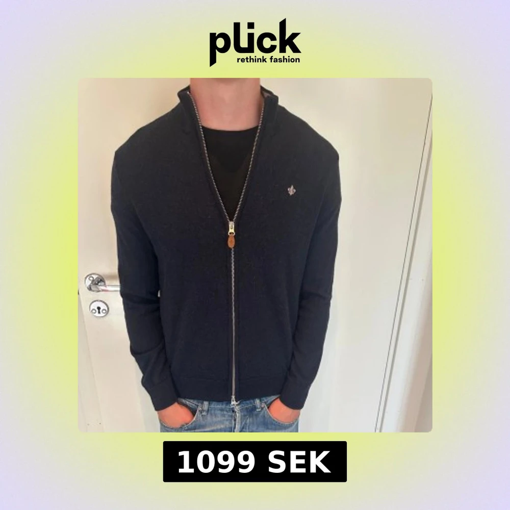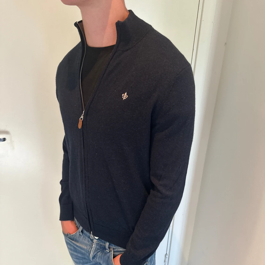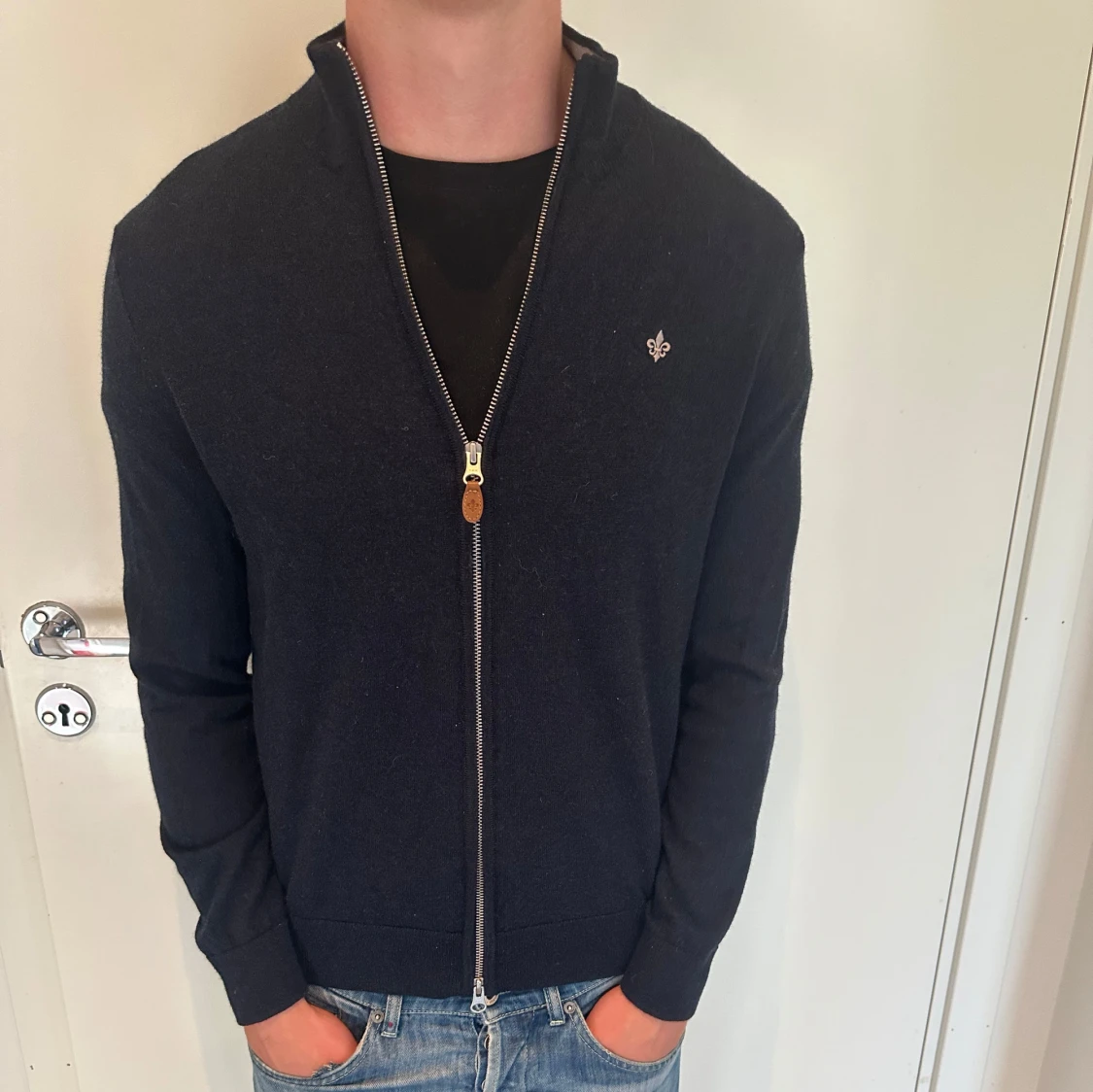 Snygg mörkblå kofta från Morris med hel dragkedja och liten broderad logga på bröstet. Tröjan har lång ärm, ribbade muddar och står upp lite i kragen. Perfekt till jeans och funkar året runt. Använd 2-3 ggr, nästan helt ny. Modell 176, väger 65. Storlek M men passar även S