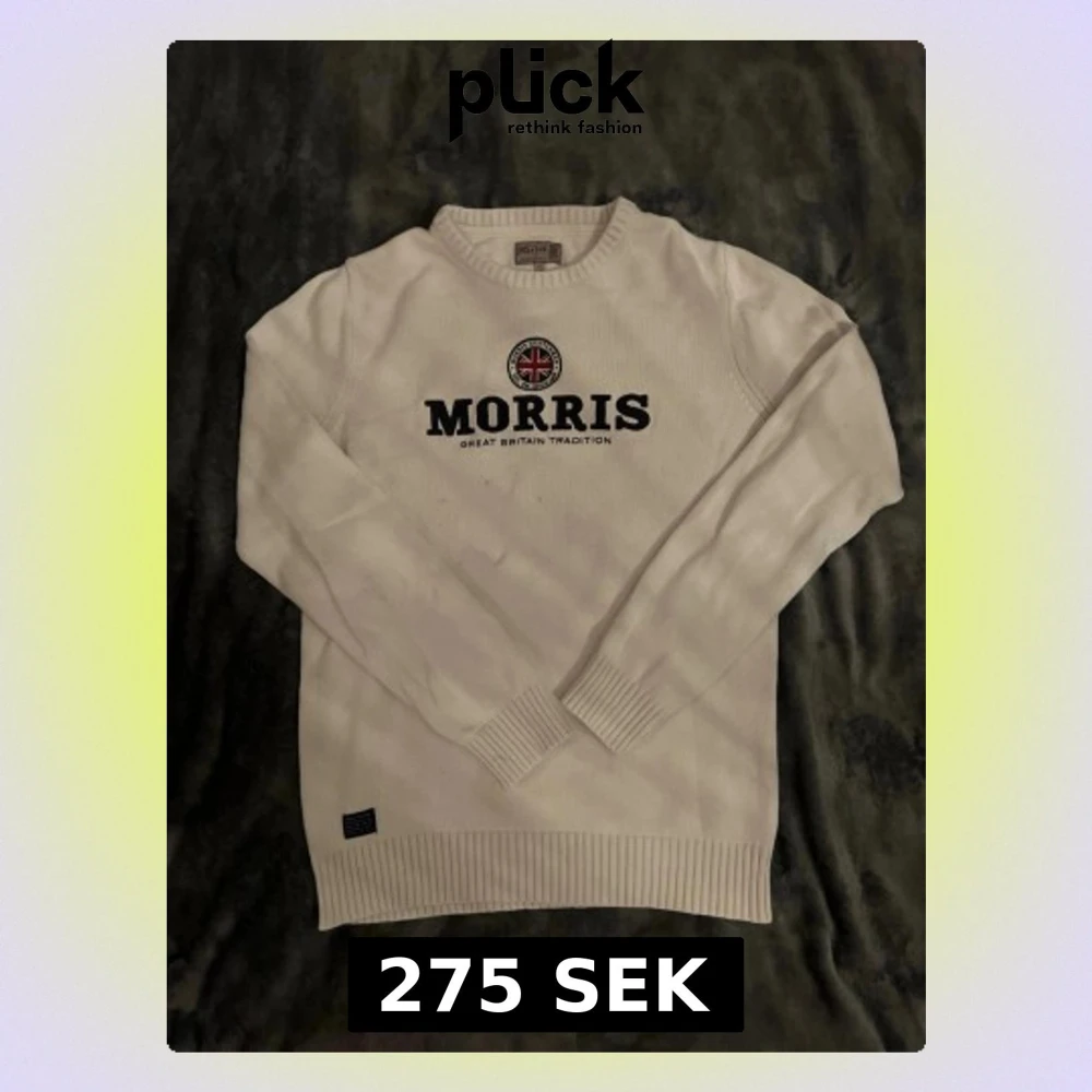 Snygg vit stickad tröja från Morris med rund halsringning och svart broderad logga samt Union Jack-detalj på bröstet. Tröjan har ribbade muddar vid ärmslut och nederkant. Perfekt till en clean och klassisk stil. Har några fläckar men är rätt säker på att dom går bort i tvätt m. Pris kan diskuteras vid snabb affär!