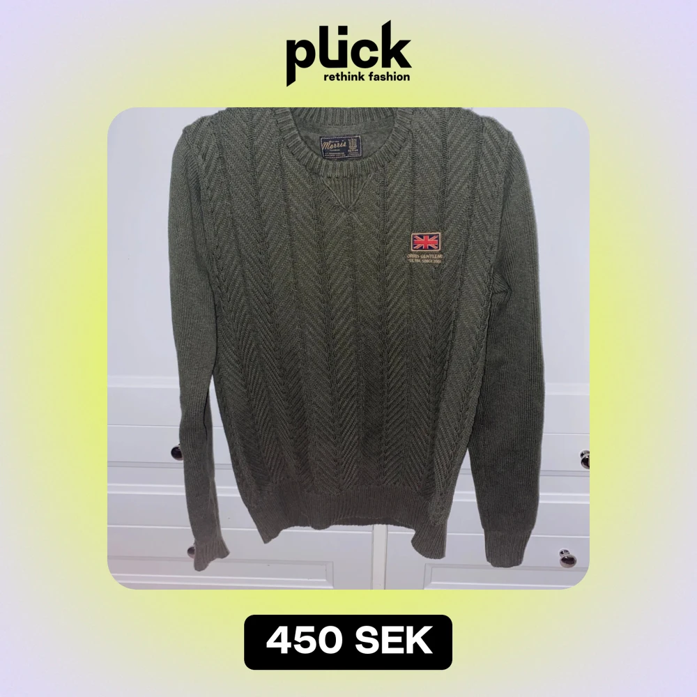 Säljer en snygg grön stickad tröja från Morris. Den har ett diskret märke med brittisk flagga på bröstet och ett klassiskt kabelstickat mönster. Perfekt för kyliga dagar och passar både till vardags och lite finare tillfällen. Tröjan har långa ärmar och en rund halsringning.