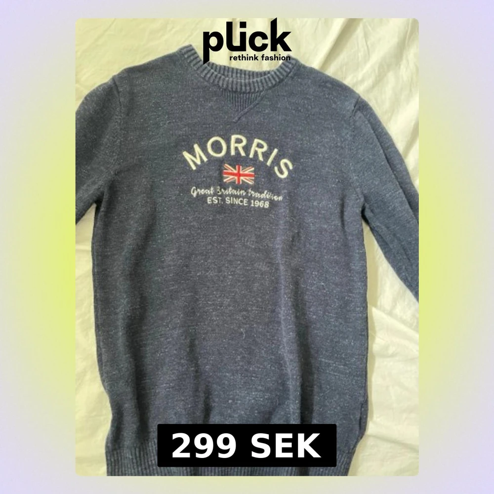 Mörkblå stickad tröja från Morris med broderad text och brittisk flagga på bröstet. Tröjan har rund halsringning, ribbade muddar och är tillverkad i mjukt material. Perfekt för dig som gillar klassisk och stilren design.