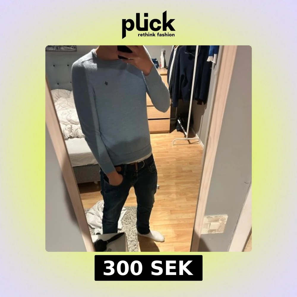 Snygg ljusblå stickad tröja från Morris, den är i storlek S men skulle säga den passar XS, killen på bilden är 175. Skriv för mer frågor eller funderingar, Mvh