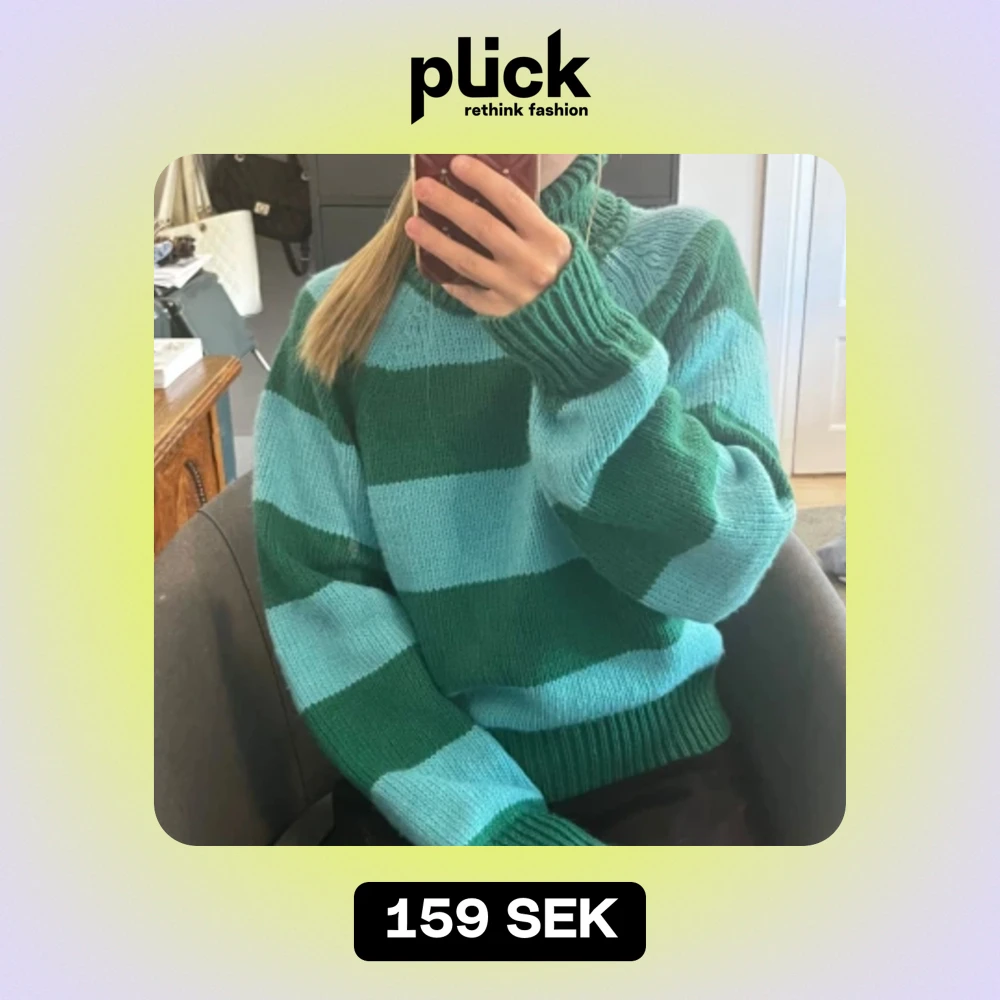 Blå och grön stickad tröja med hög krage. Kommer inte till användning.